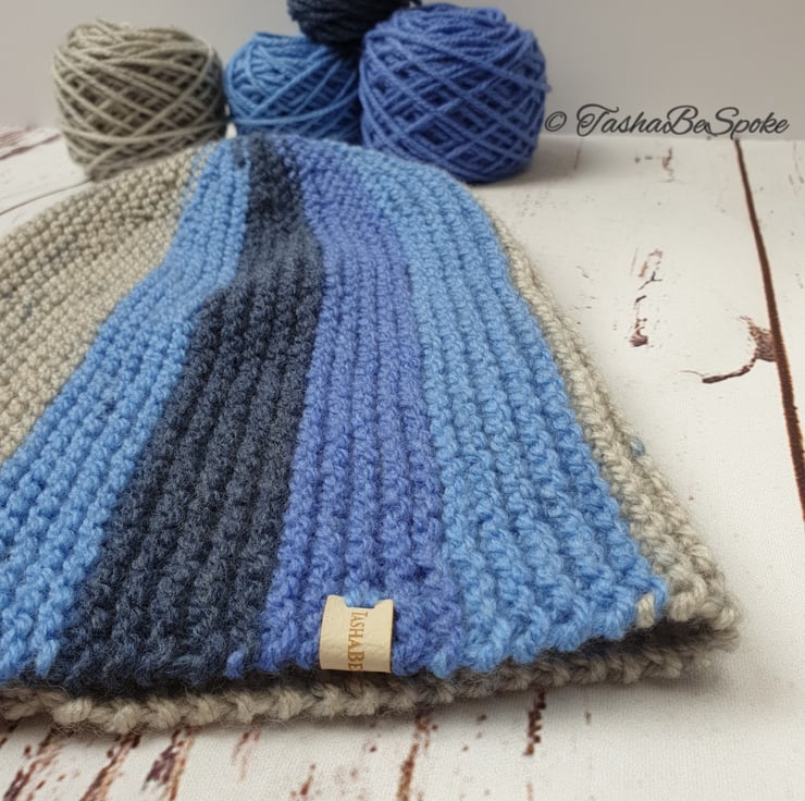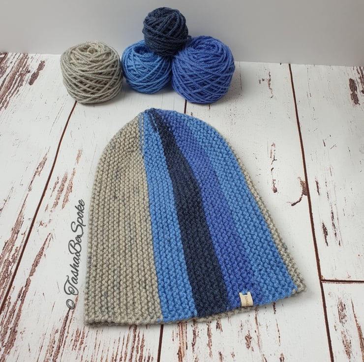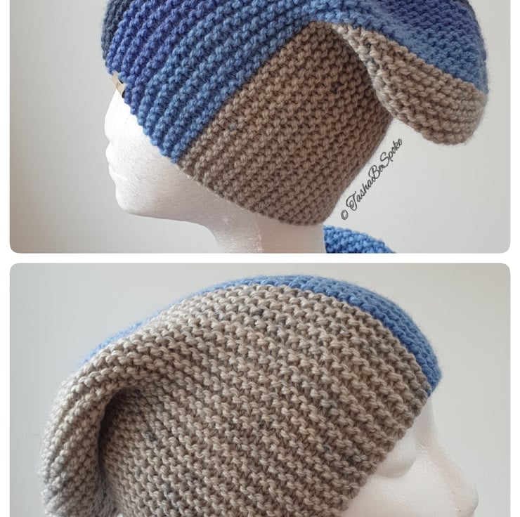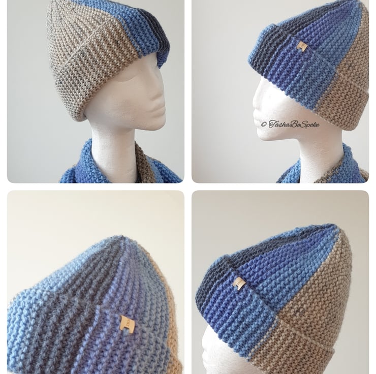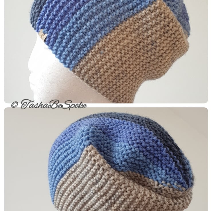 This hat knitted across with soft chunky yarn (20% wool, 80% acrylic). Designed to be worn in many different ways, with a soft brim that you can roll up and down to the right length.