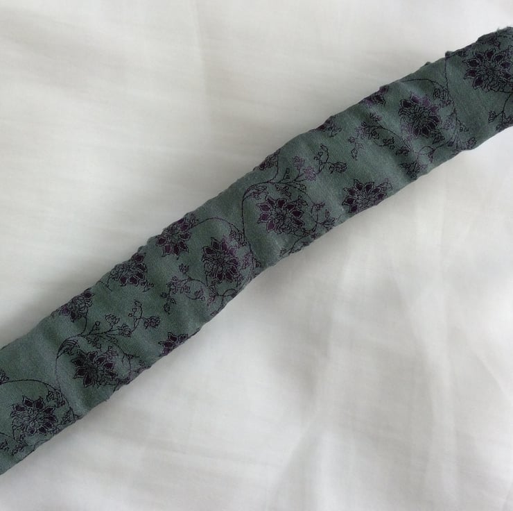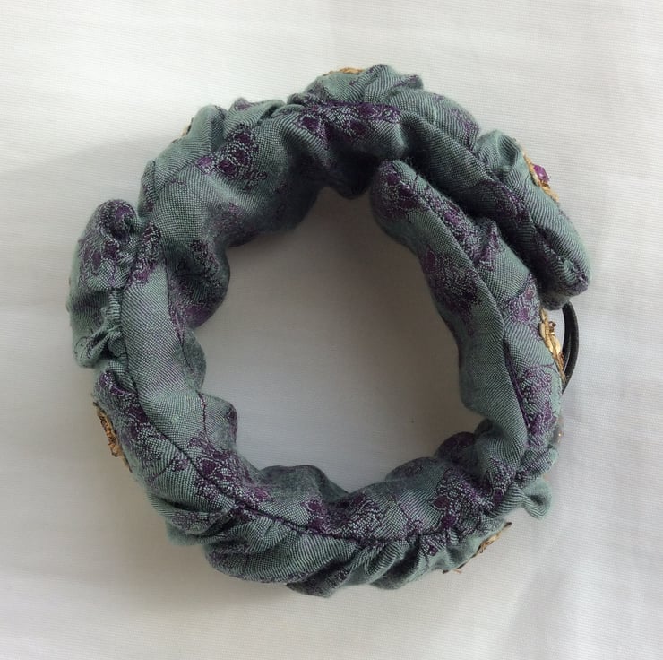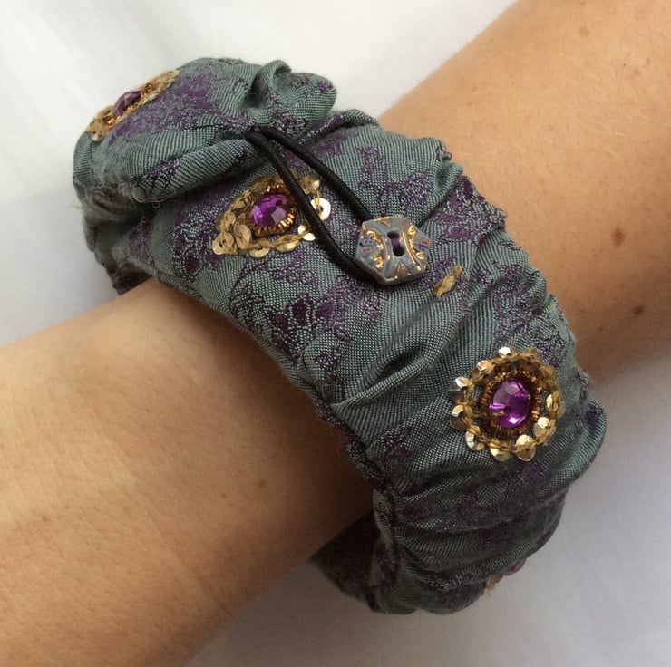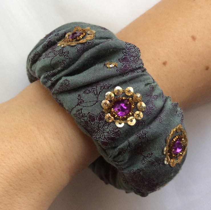 This is a very special, fabric bracelet or cuff. This vintage feel textile is repurposed from a beautifully decorated, preloved garment. The grey green background fabric with delicate purple flowers is probably Indian silk. It is richly embellished with tiny gold sequins and pinky purple jewels. I have condensed the pattern by gathering the fabric which has added interest and texture to the bracelet.