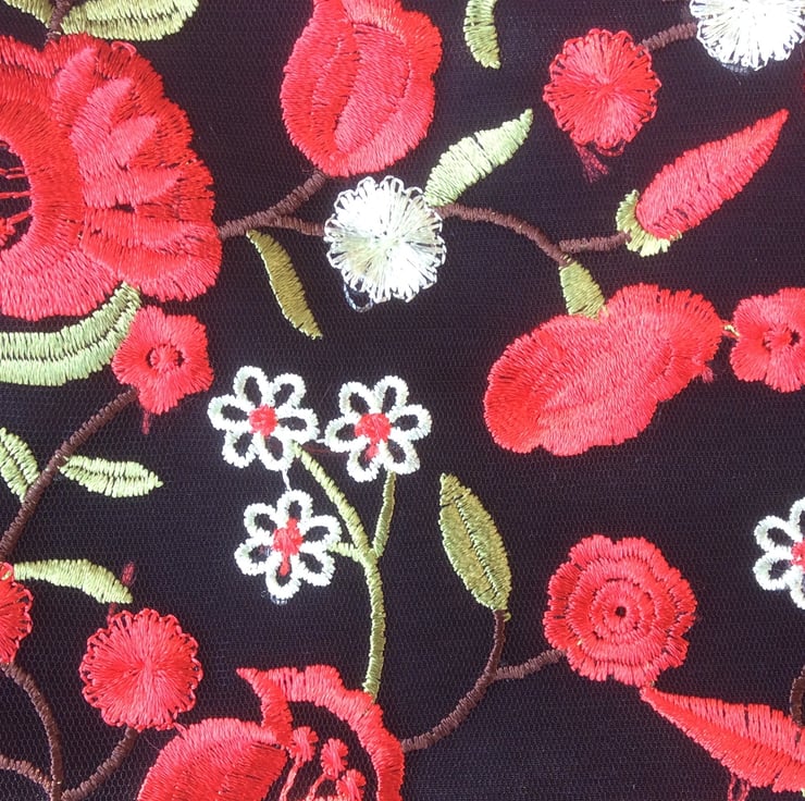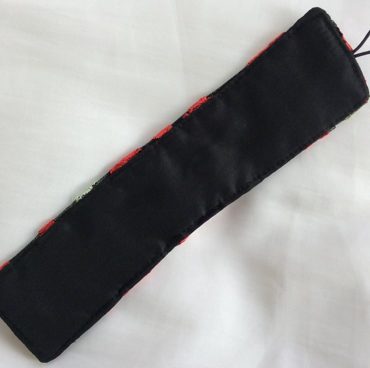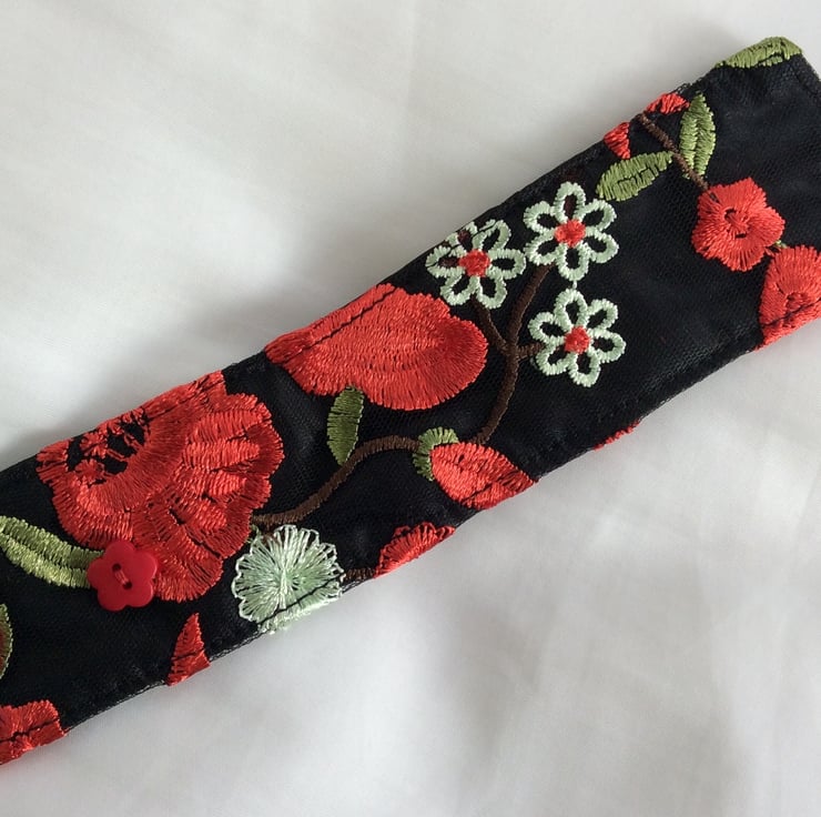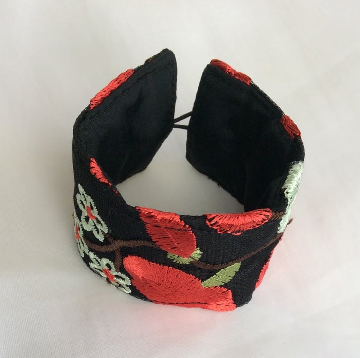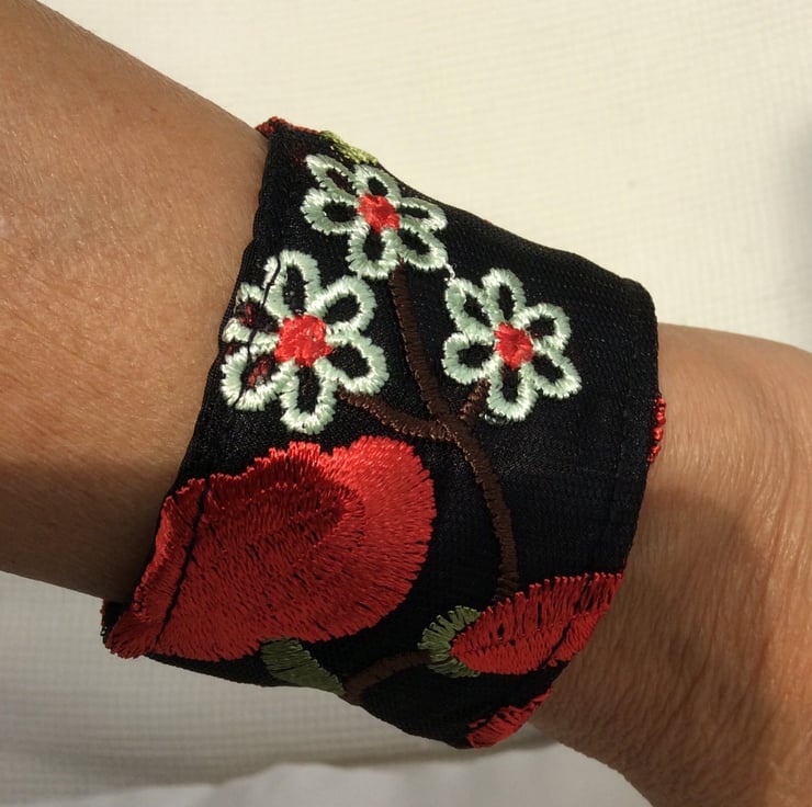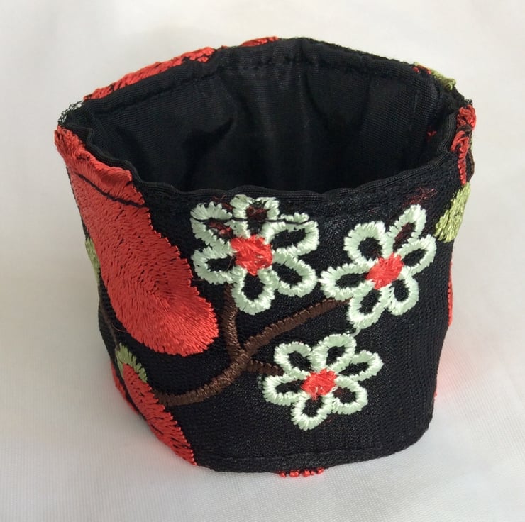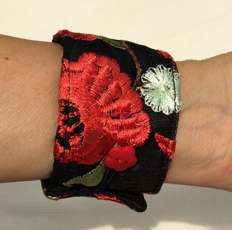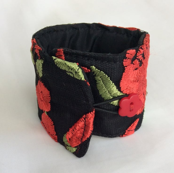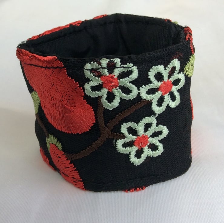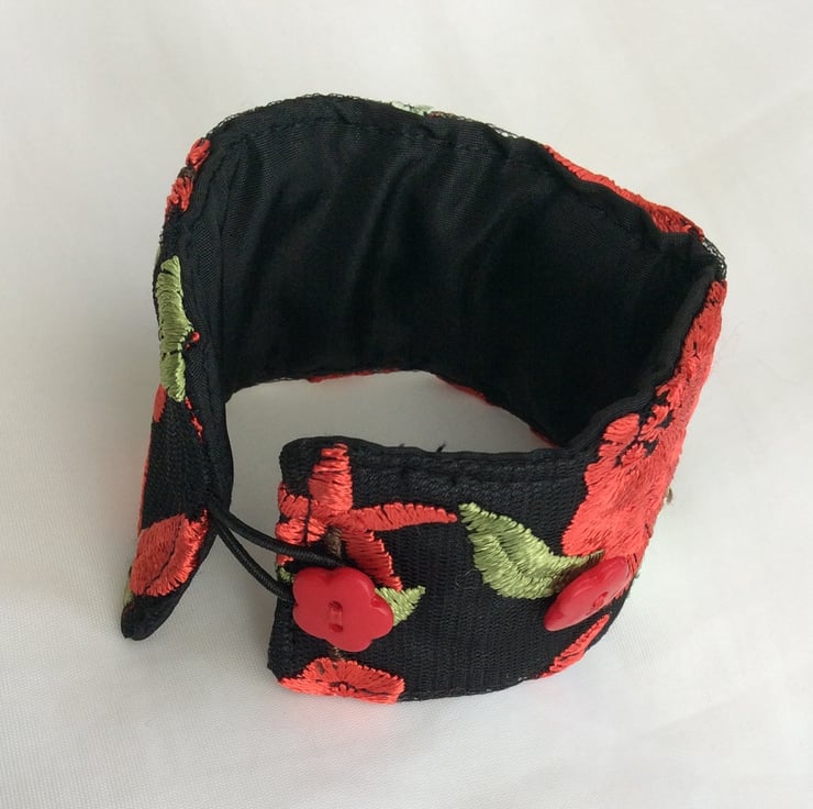 This eye catching wrist cuff is repurposed from a beautifully decorated, preloved garment. The cuff is made from embroidered black net over black China silk, lined with black satin and interlined with a layer of felt to give it structure. There is a black elastic loop and two small red flower button fastenings so the fitting can be adjusted.