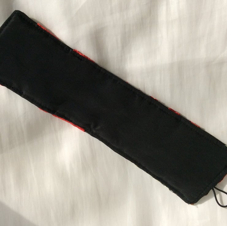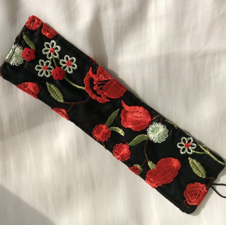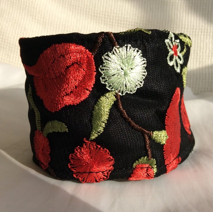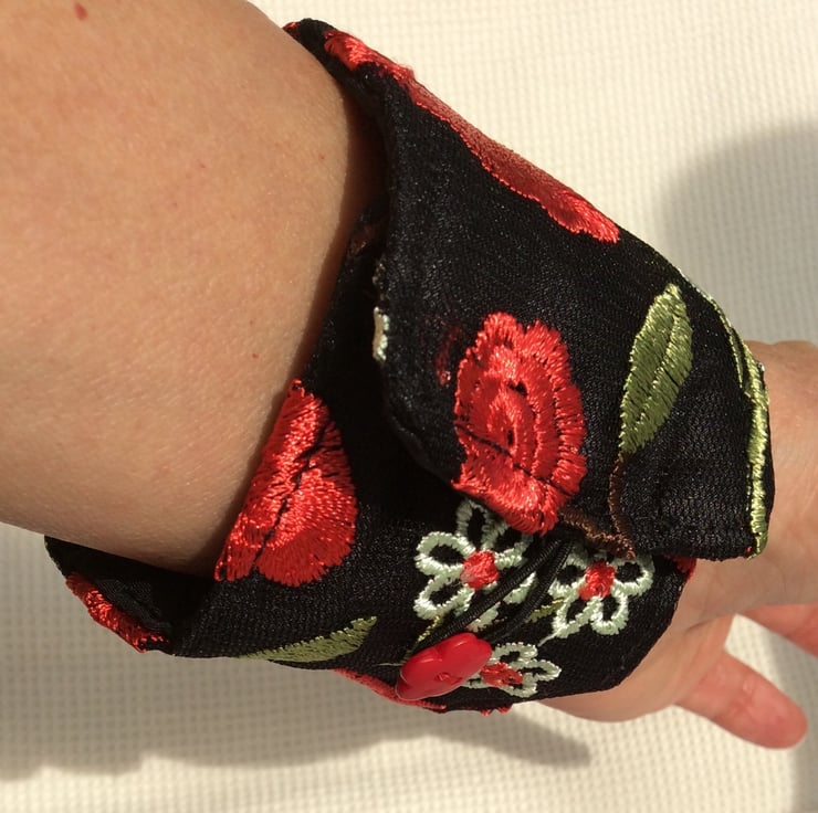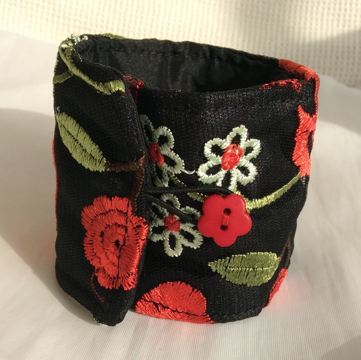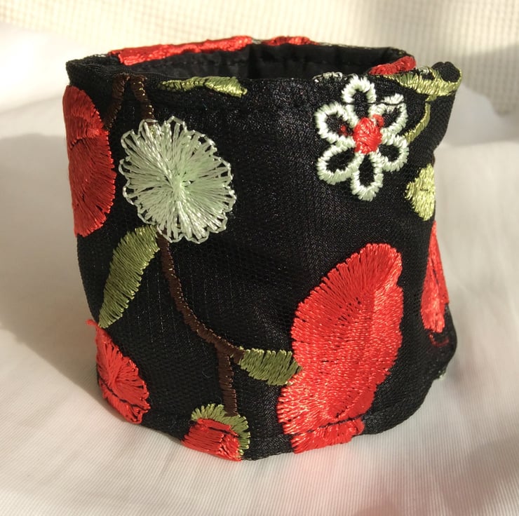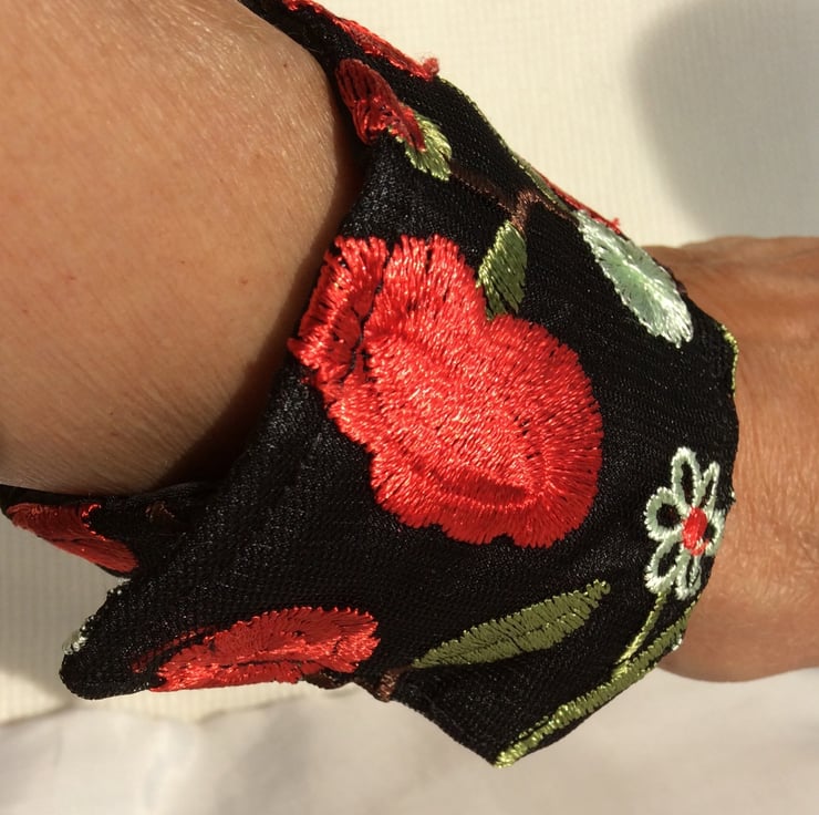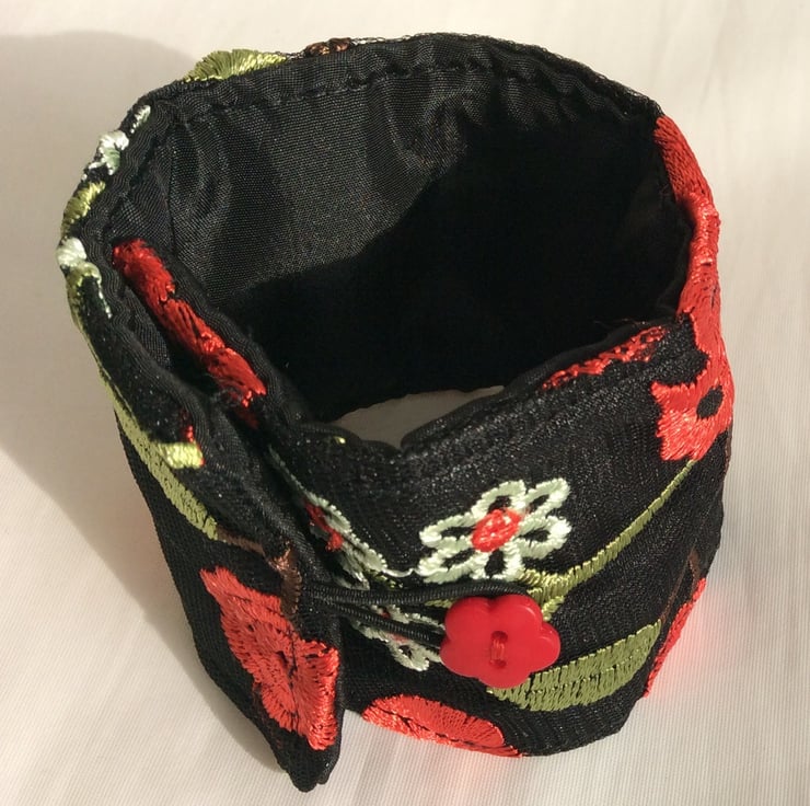 This eye catching wrist cuff is repurposed from a beautifully decorated, preloved garment. The cuff is made from embroidered black net over black China silk, lined with black satin and interlined with a layer of felt to give it structure. There is a black elastic loop and two small red flower button fastenings so the fitting can be adjusted.