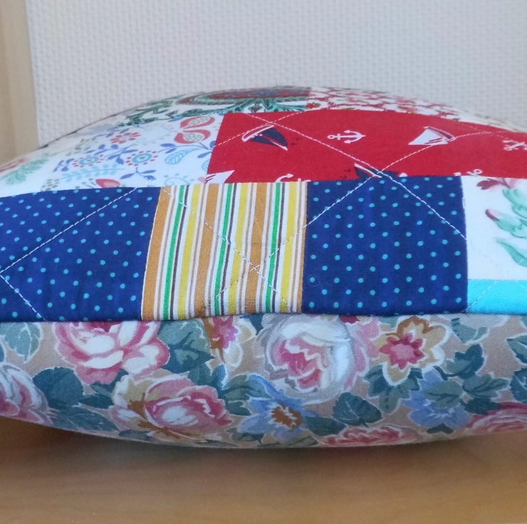 This cushion has been made from many pieces of cotton and poly/cotton fabrics left over from other projects and put to good use instead of being thrown away.