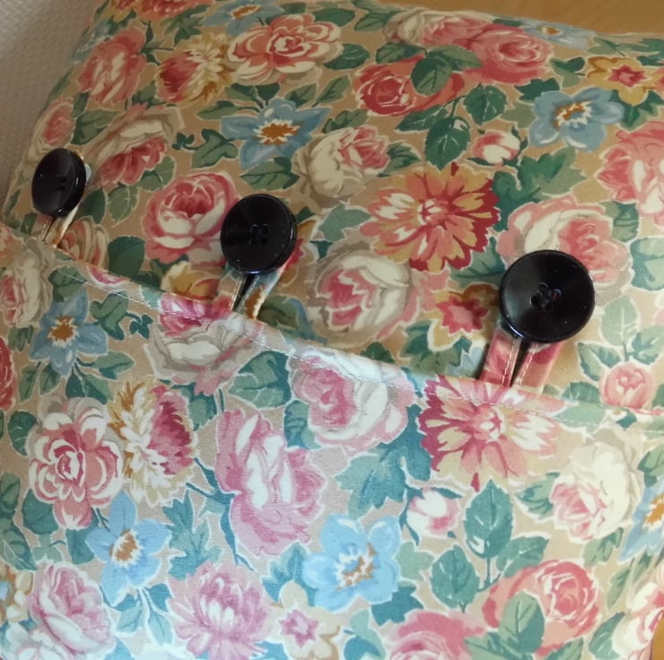Once I had stitched all the pieces together to make the patchwork fabric, I backed it with fleecy fabric and sewed rows of diagonal stitching all over to achieve a slightly quilted effect. I have backed the over with a beautiful roses print cotton fabric and the back fastens with loops and three black buttons.