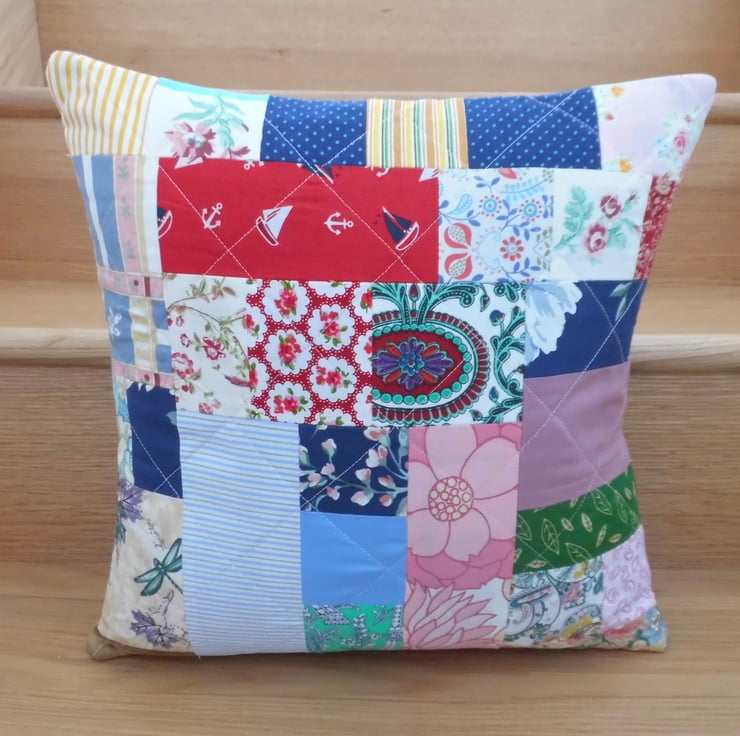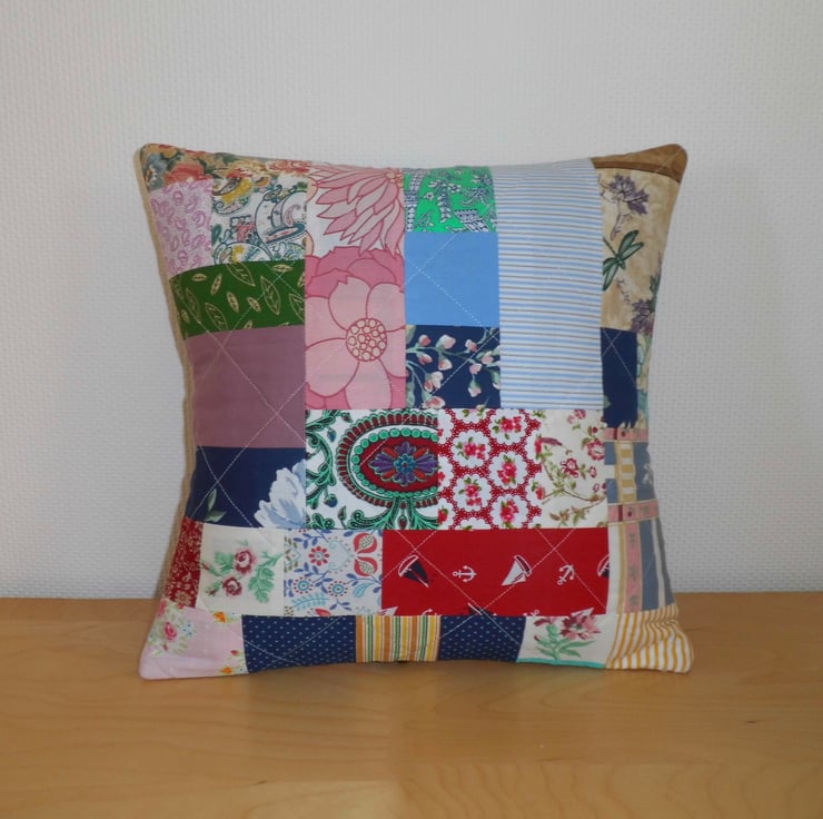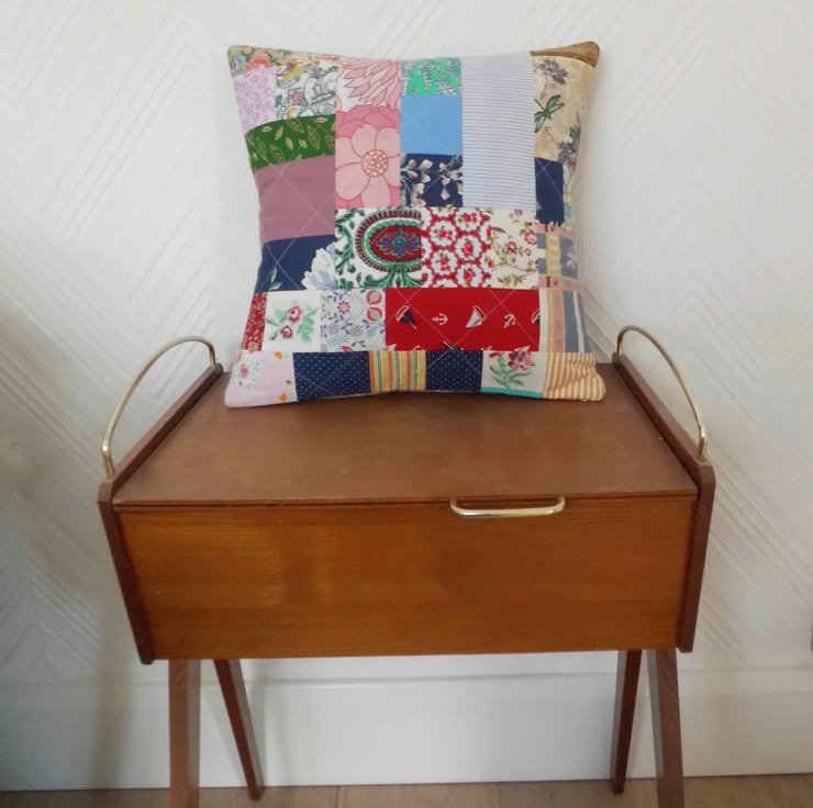 I save all the fabric off cuts from my other projects and join them together to make patchwork, sometimes in squares and sometimes more randomly like this cushion. Lengthy work, but very satisfying!