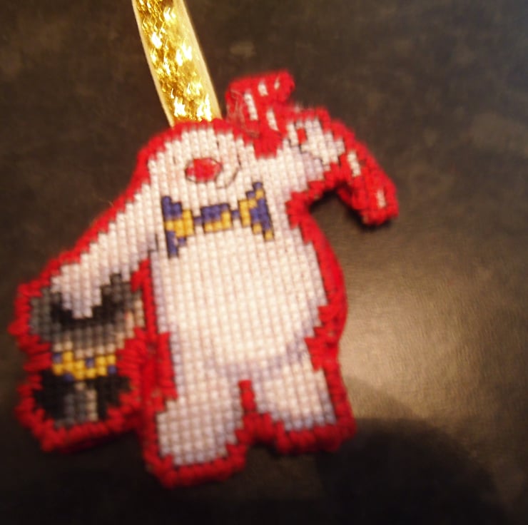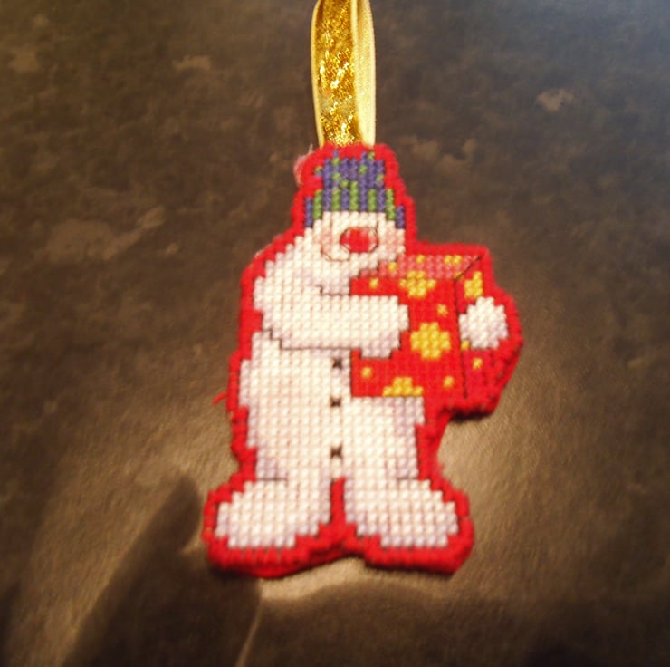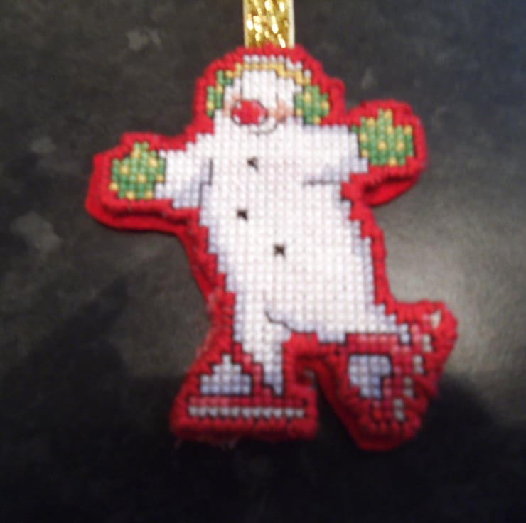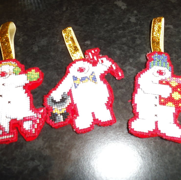 A SET OF 3 CROSS STITCHED TREE DECORATIONS ON PLASTIC WITH A FELT BACKING