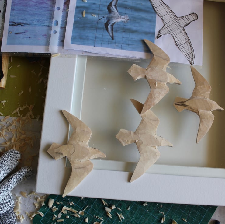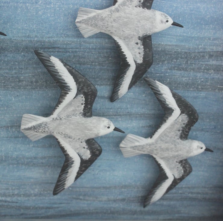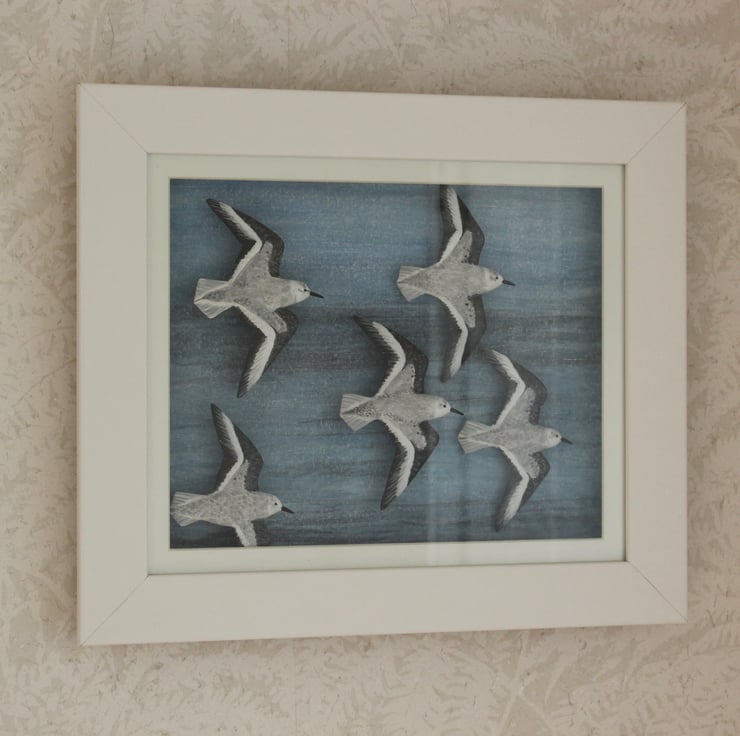 This lovely box frame picture features 5 hand carved flying sanderling. Each bird was carved from a 10mm thick sheet of lime giving a curve to the wing and "movement". They have been painted with artists acrylics and mounted on different length pegs giving a feeling of depth. The backboard is painted with tones of blue and grey to give the impression of water.