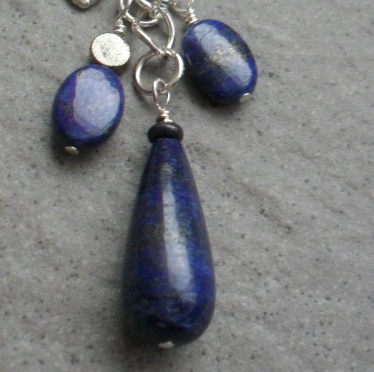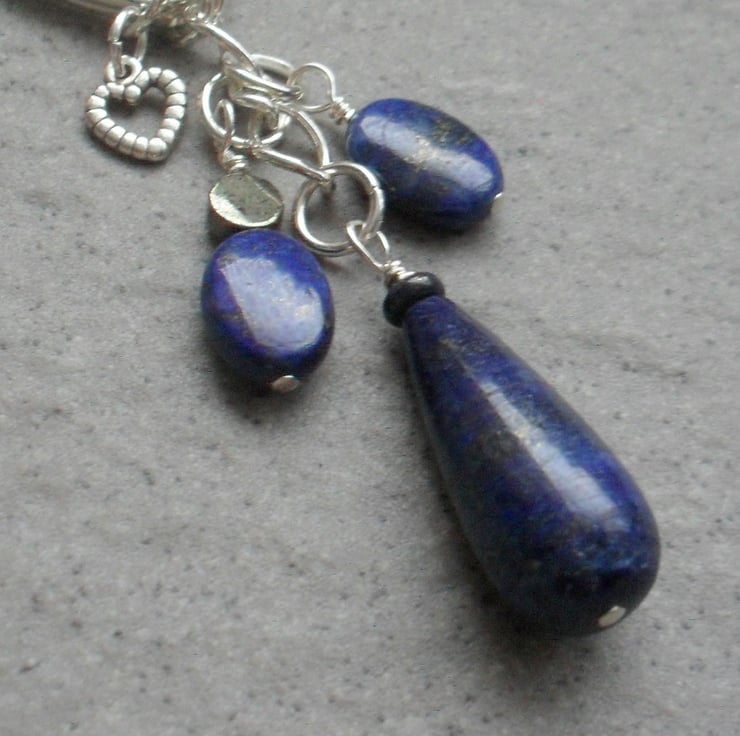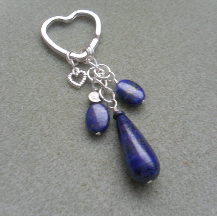 Semi precious gemstones of lapis lazuli and pyrite are attached to a heart shaped split ring