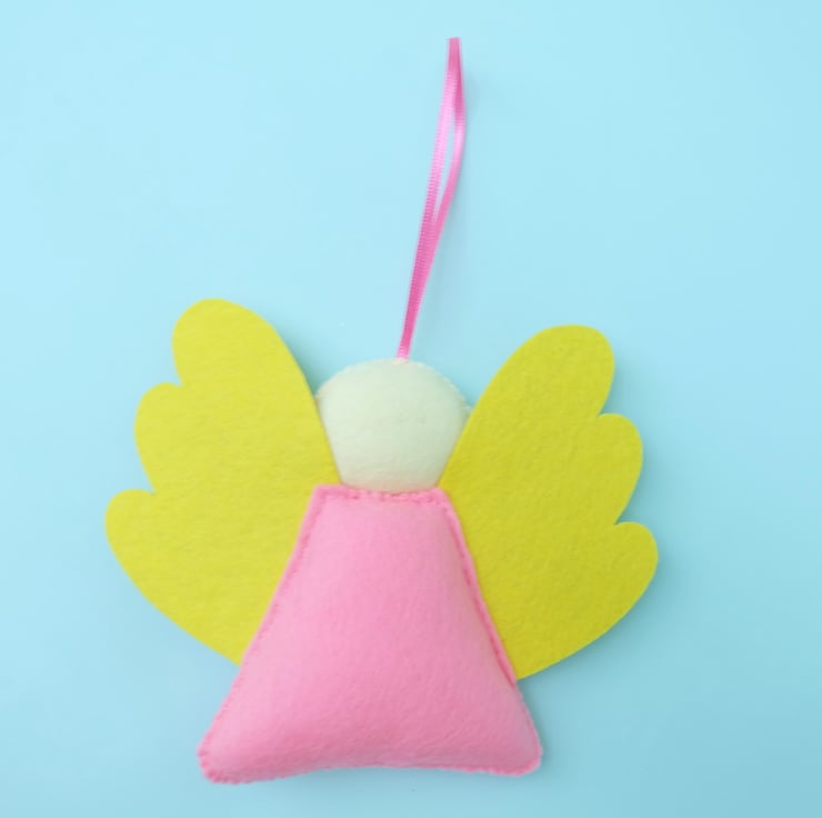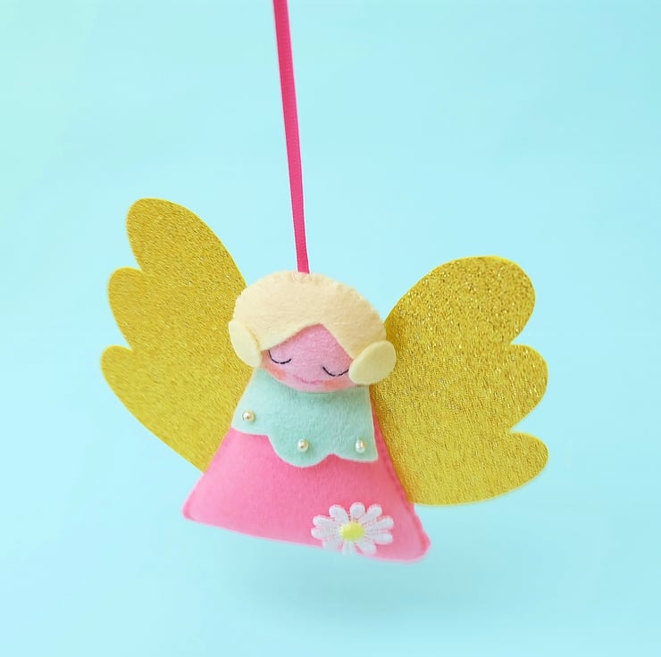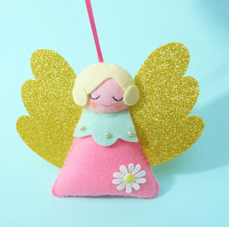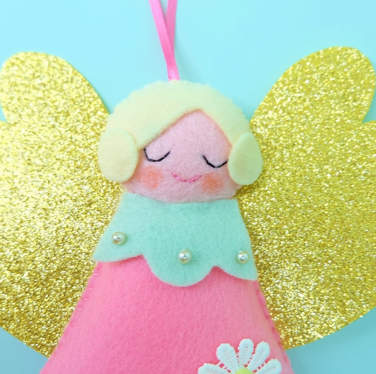 This retro angel felt Christmas decoration is so sweet and fun. I have designed and hand cut, sewn, stuffed and glued her using delicious merino wool felt and given her gold glitter felt wings. She has a bright candy pink body with a daisy accent trim, a mint green collar with hand sewn pearl beads and a sweet embroidered face with painted cheeks. Her hair is pale yellow.