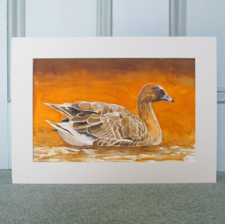 Watercolour painting of a pink footed goose 28 x 18cm. Supplied with board window mount, overall size 36 x 25cm (14 x 10in). It will fit a standard size frame.
