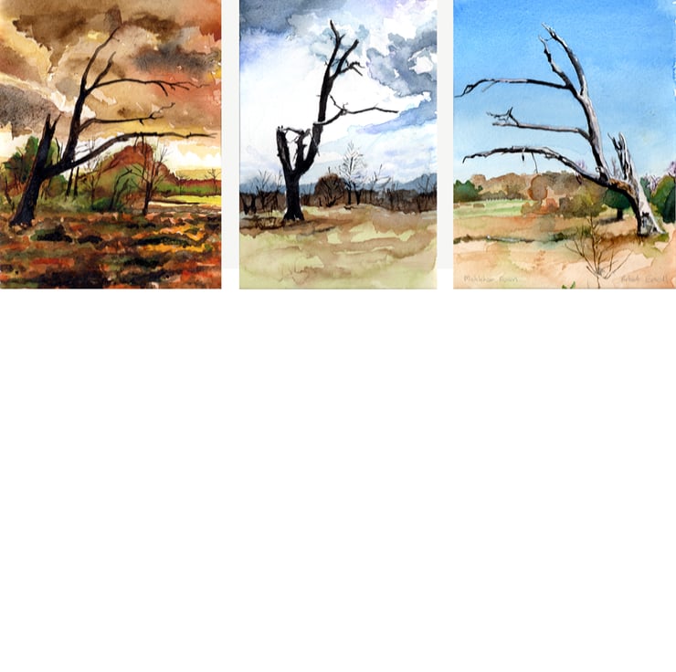 Three views in watercolour of a dead tree on Middleham Down in the Surrey North Downs at different times of the day. 11 x 14.5cm, 10 x 14.5cm and 11 x 14.5cm. Window mounted as a triptych. Overall mounted size 29.7 x 42 cm (A3). Mount could be trimmed to fit a bespoke frame.