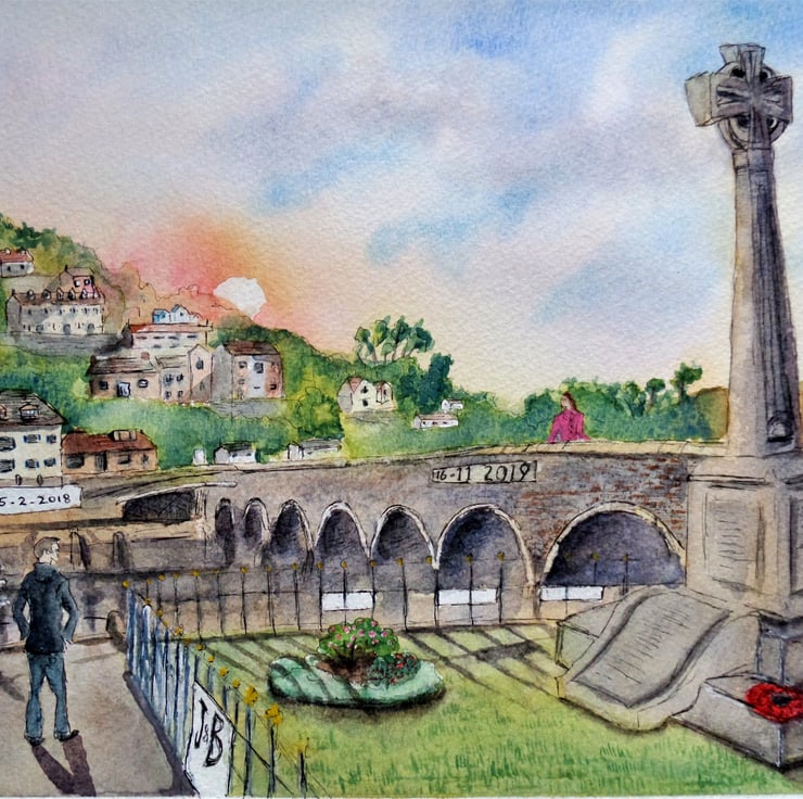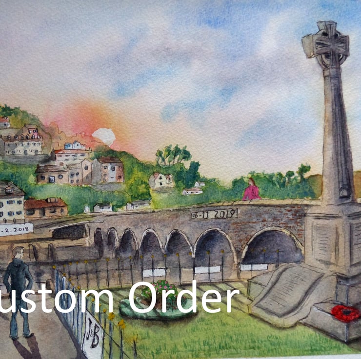 The order is for a framed and mounted watercolour painting 40 cm x 30 cm total dimension, painting within mount approx 31 cm x 23 cm., of Looe war memorial and bridge. Work based on photographs and liaison with the customer regarding composition.