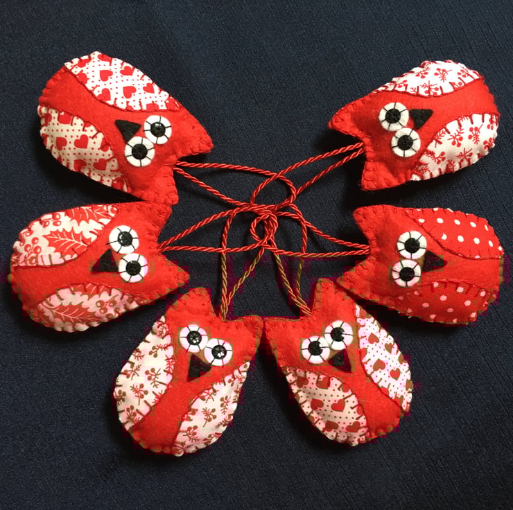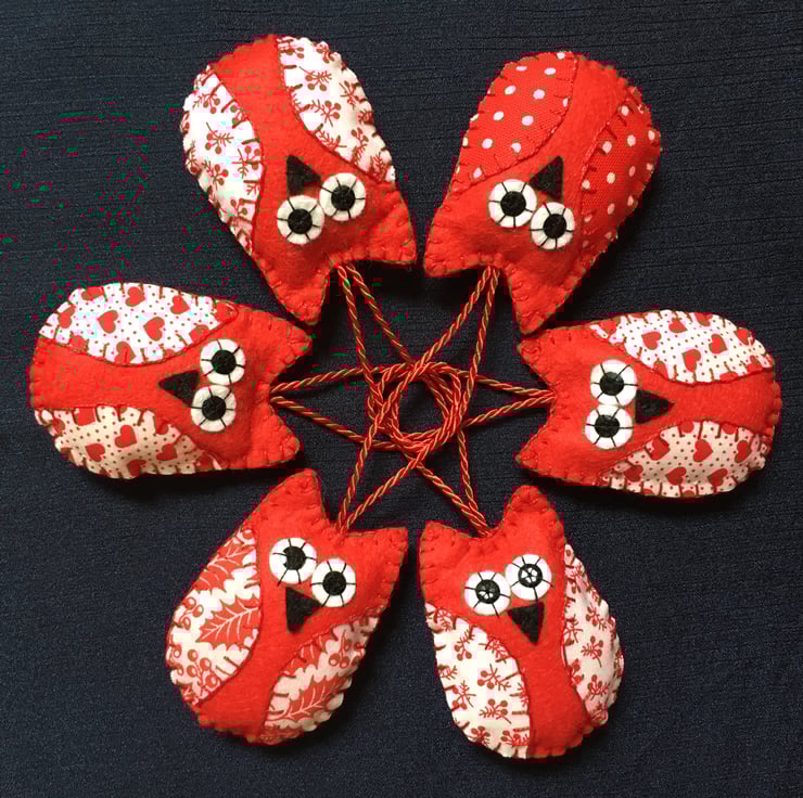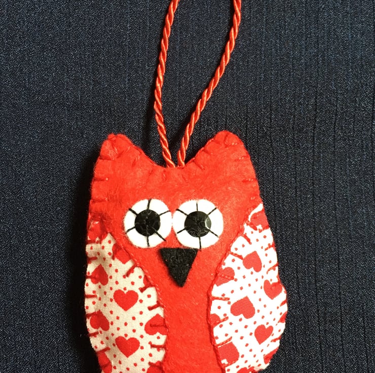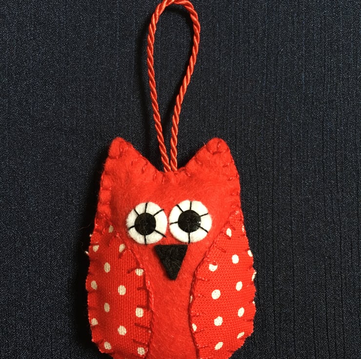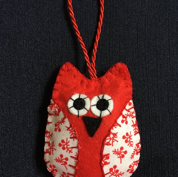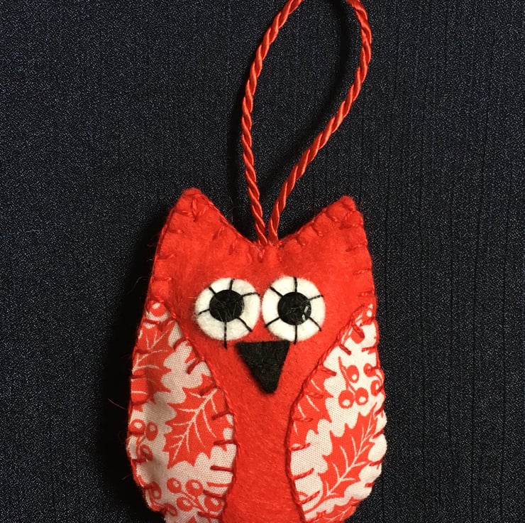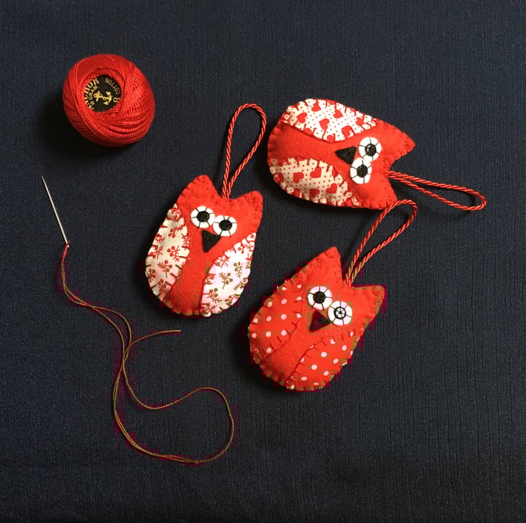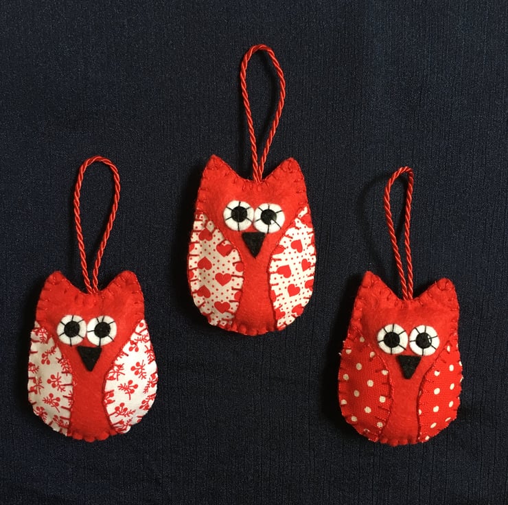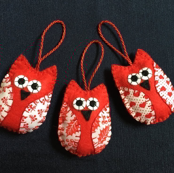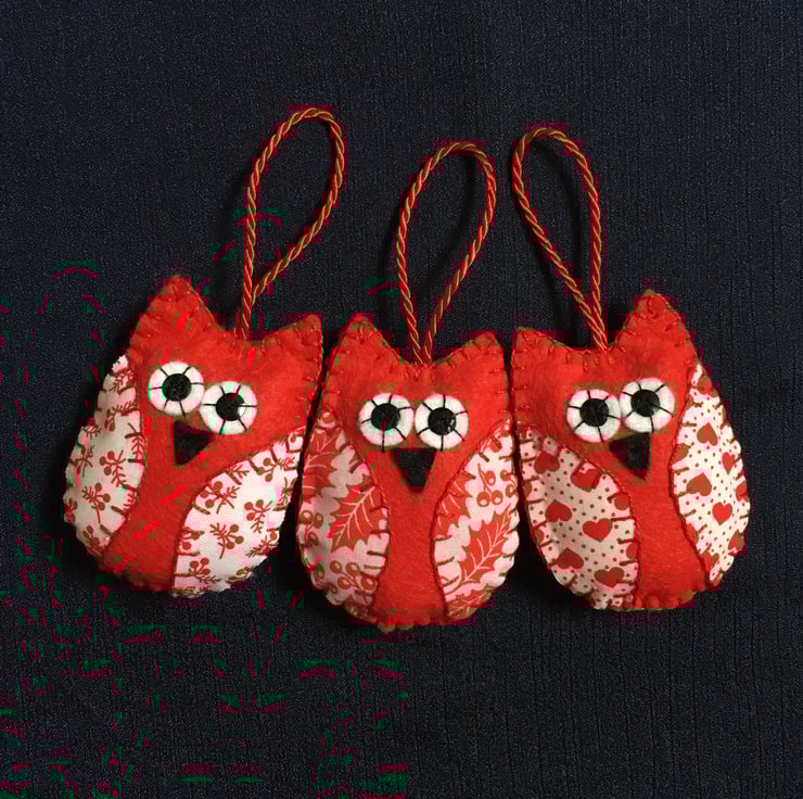 A set of 3 felt owl Christmas decorations that would make a lovely addition to a Christmas tree, a special gift, or a secret Santa present.