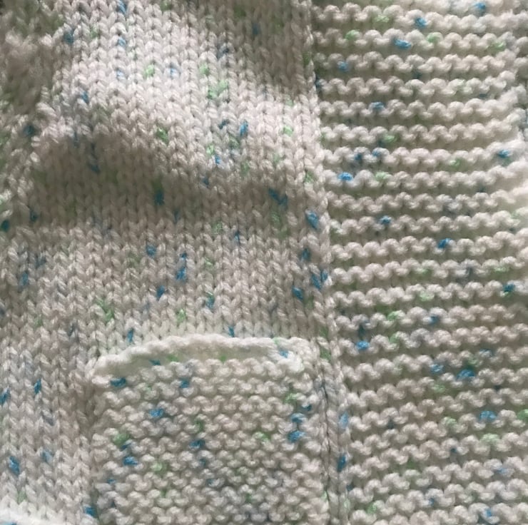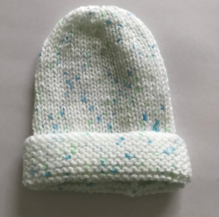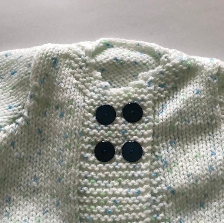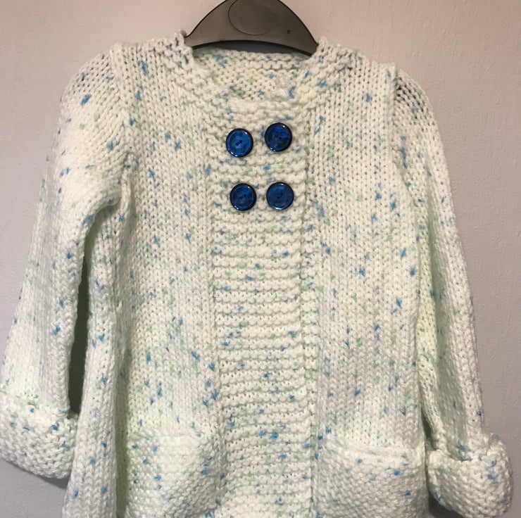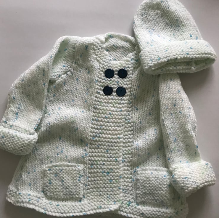 This handmade jacket with matching hat is made used a vintage pattern and is knitted in a modern washable yarn. The jacket has double breasted buttons at the top, two pockets and rolled back cuffs. The hat has a rolled back brim.
