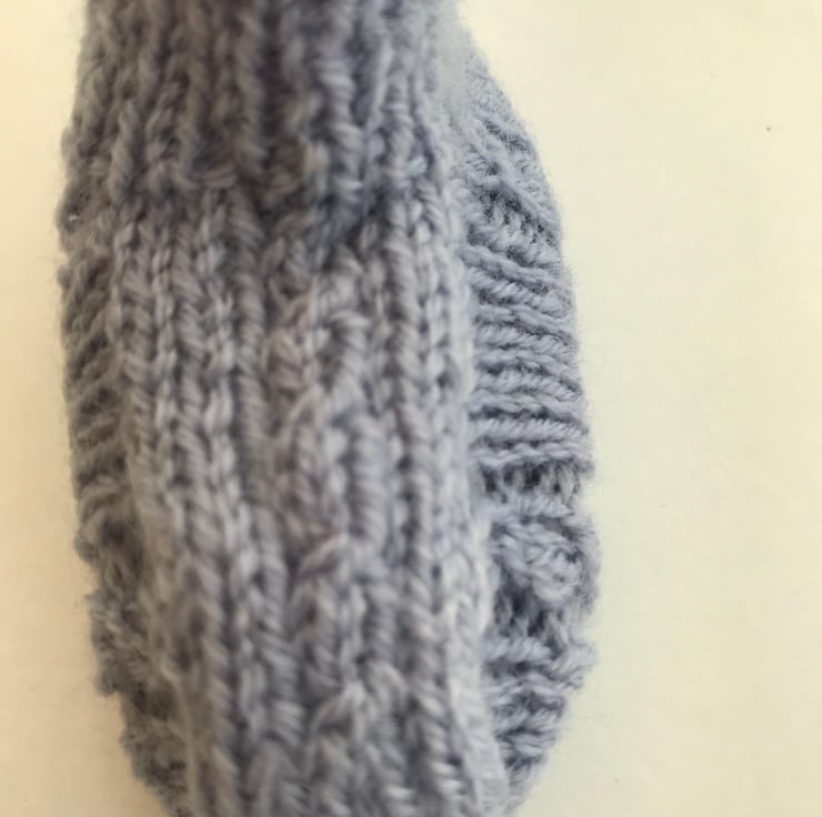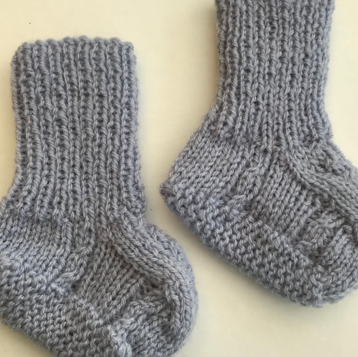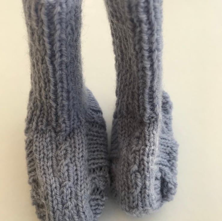 Handmade bootees knitted using a vintage pattern and in vintage wool blend yarn. They have a tiny cable pattern on the sides and front and have a long ribbed sock like top.