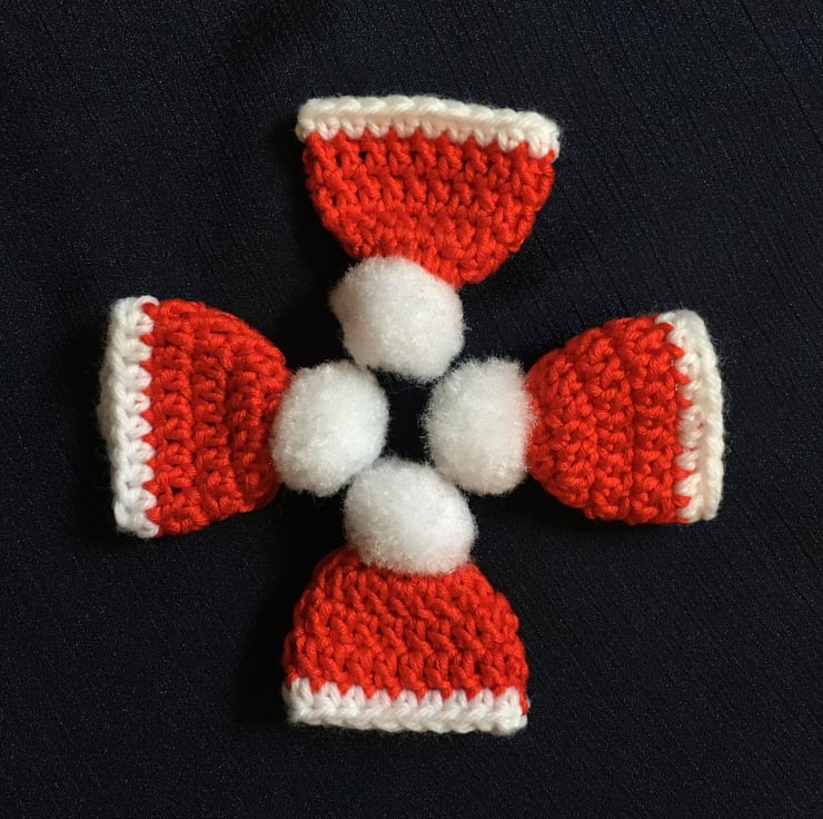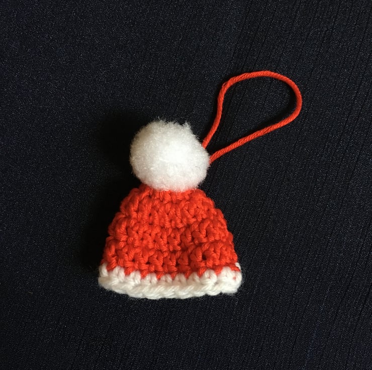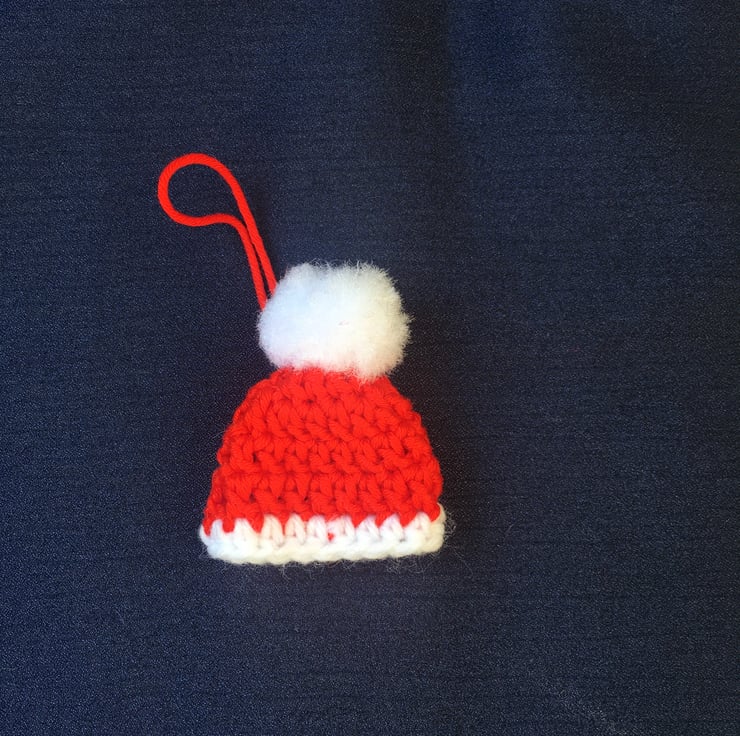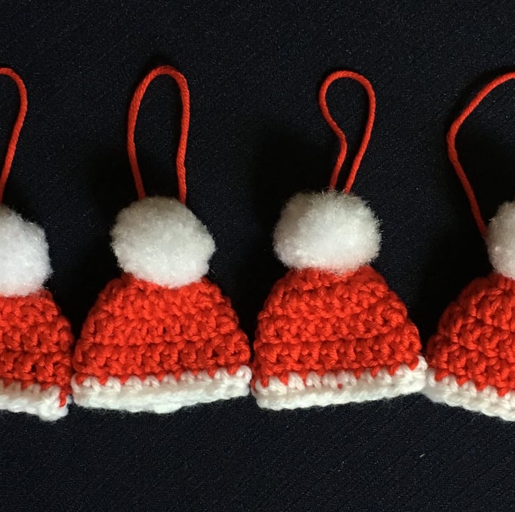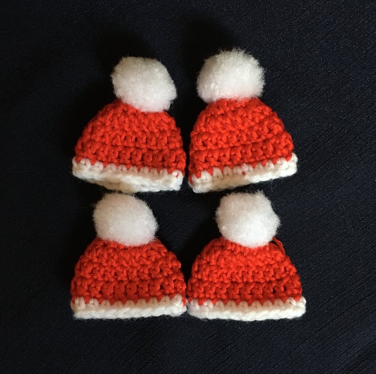 Each beanie has been hand crocheted from coloured cotton, and finished with a white trim and a fluffy pompom.