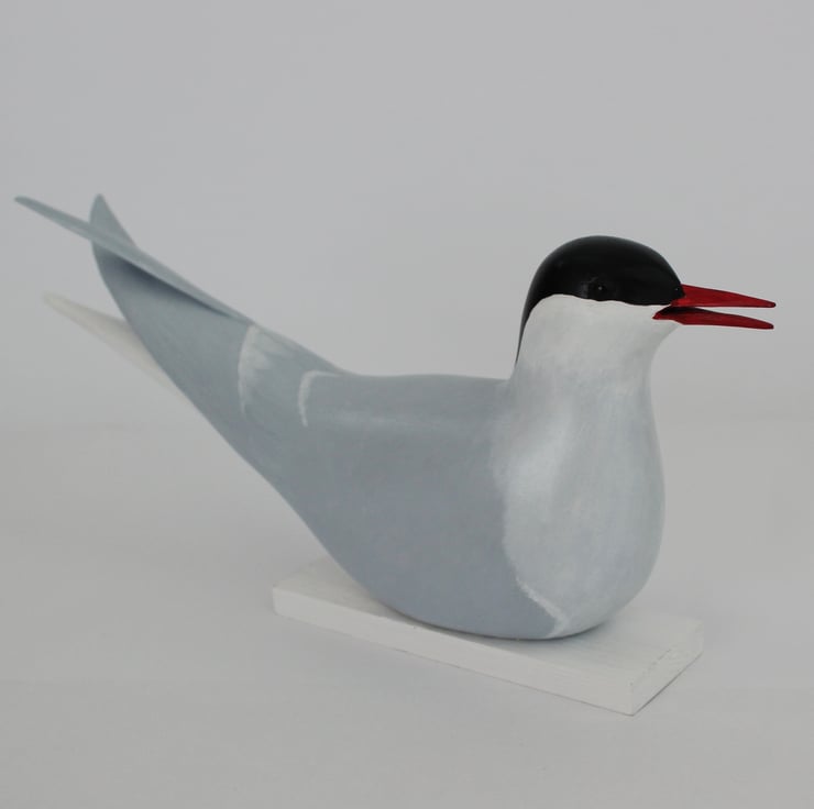 This sitting arctic tern has been hand carved from wood. It has crossed wing feather detail and an open beak. It has hand tinted glass eyes and has been painted with artists acrylics and finished with wax giving a soft shine. It is mounted on a simple white painted wood base. It is 28cm from beak to tail,12.5cm tall and 6cm deep.