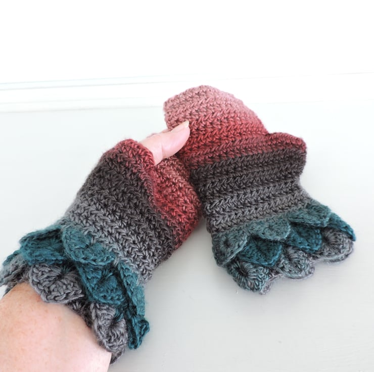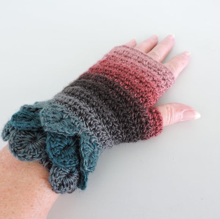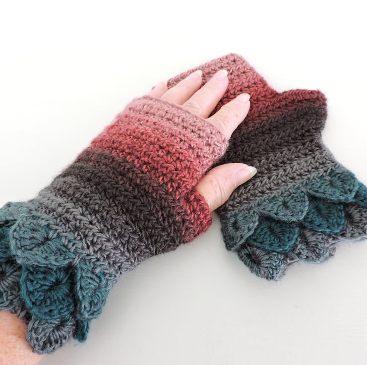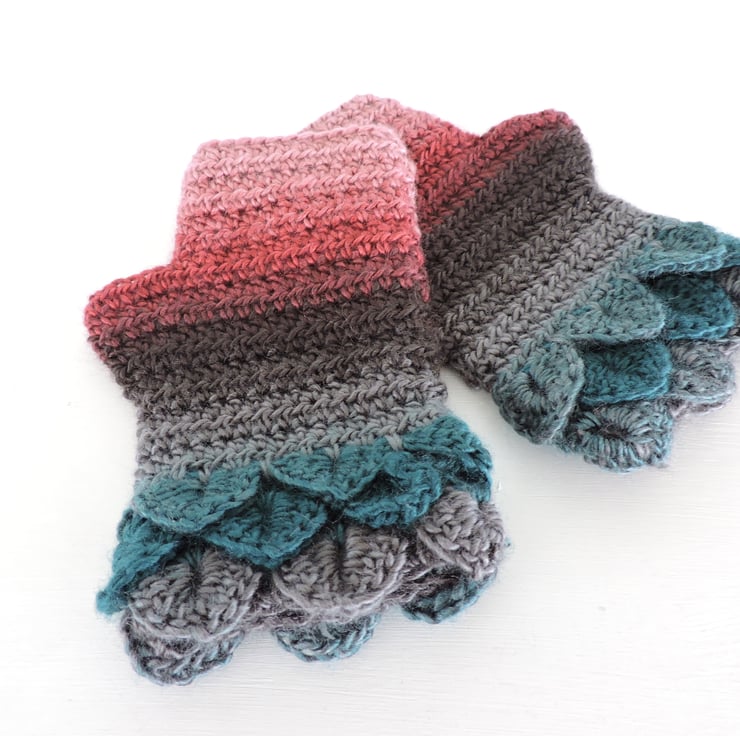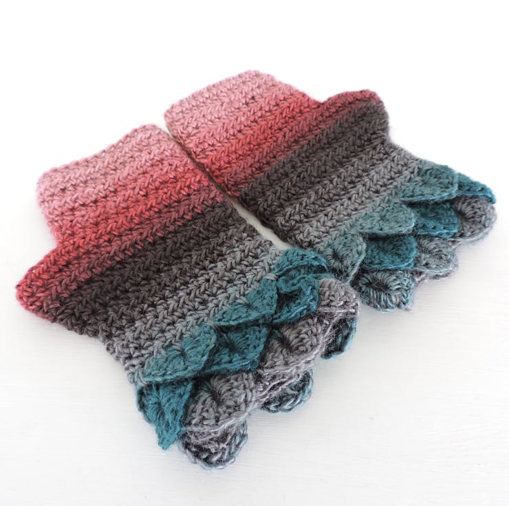 I've made these adults dragon scale cuff crochet fingerless mitts, wrist warmers with a multi tonal 100% acrylic double knit yarn. A graduated yarn of sea green, charcoal, pink and grey. Dragon Scales cuffs with a plain body. Warm and cosy, ideal for the cold weather