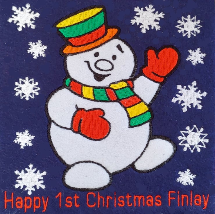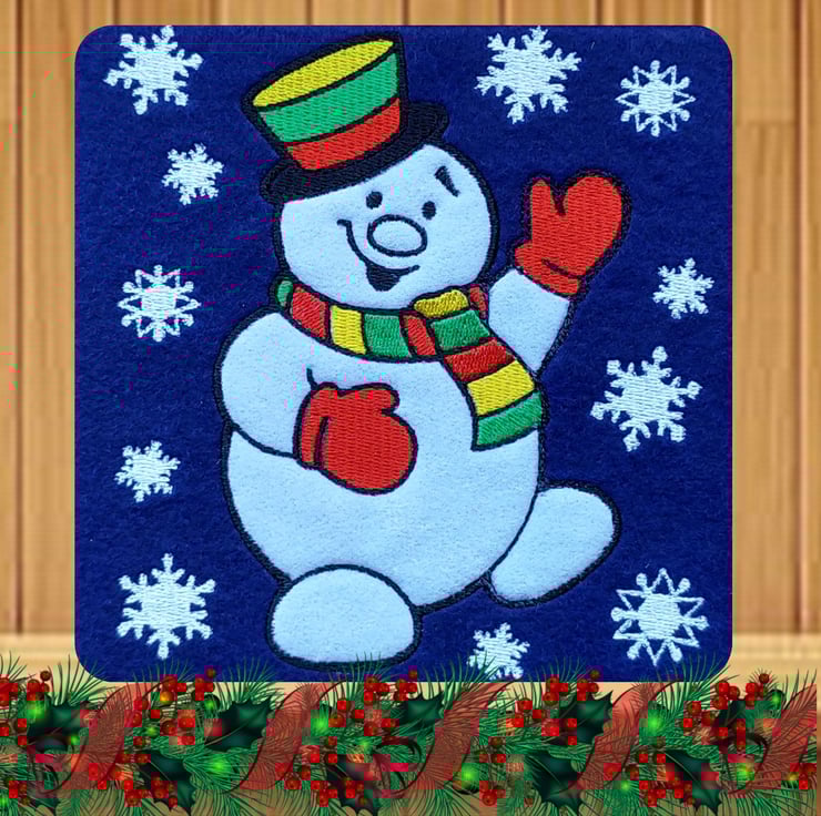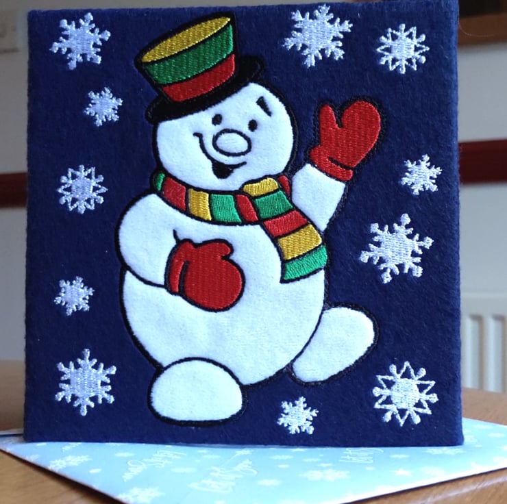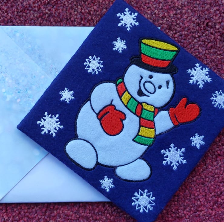 A beautiful handmade embroidered Christmas Snowman Embroidered Card