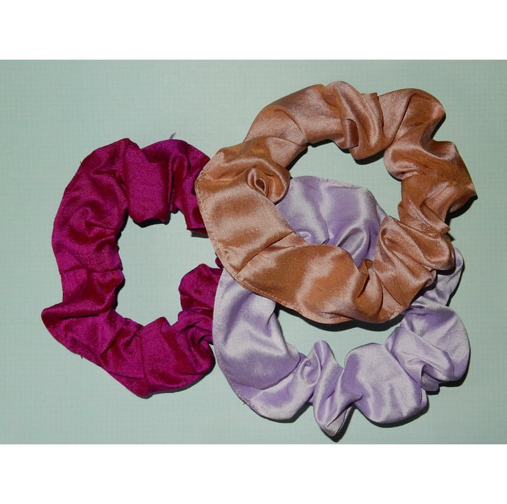 A touch of luxury for your hair, this pretty set of three silk scrunchies. These all made from silk, in a deep pink, lilac and pale gold colours, with a touch of sparkle as they catch the light. These are a generous size, and will fit two or three times around a pony tail or bun. The stretched length is approximately 20 inches.