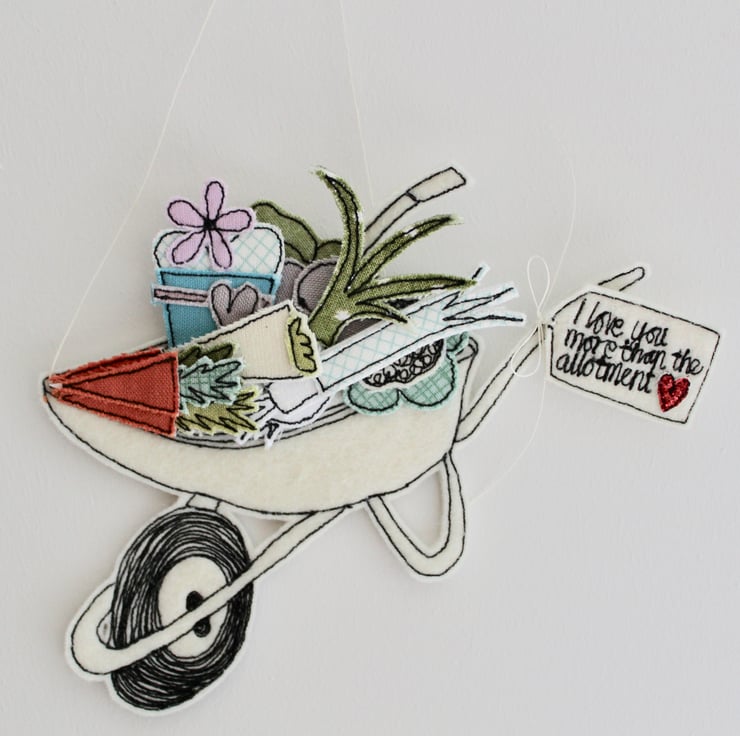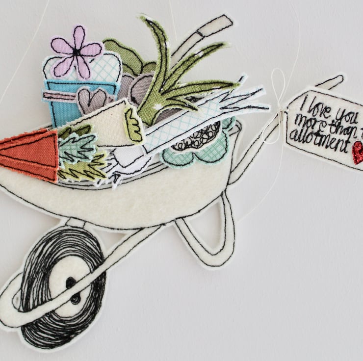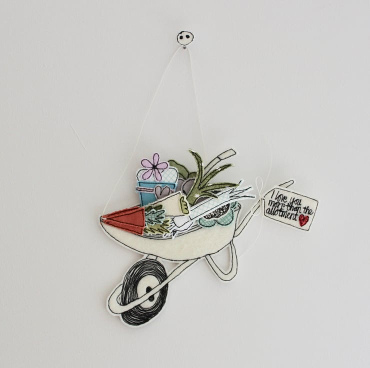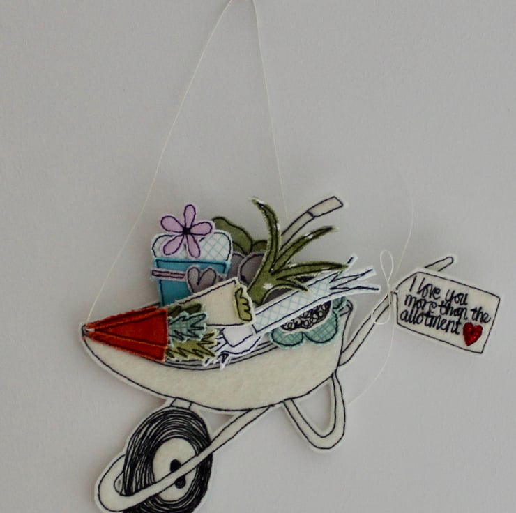 'I love you more than the allotment' is sewn using 100% wool felt, cotton cloth, glitter fabric and free hand machine embroidery; multiple layers of cloth are sewn together and cut out by hand using very sharp scissors. With a linen string to suspend.