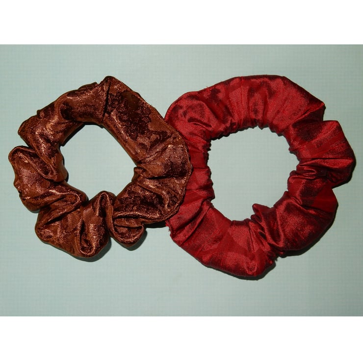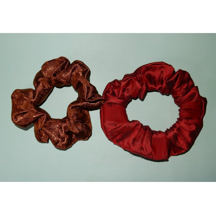 Get ready for the festive season with this pair of silk scrunchies, one red and one gold (the gold scrunchy is believed to be silk but may be a blend). These will sparkle as they catch the light, and look great to wear with Christmas outfits. These are a generous size, and will fit two or three times around a pony tail or bun. The stretched length is approximately 20 inches.