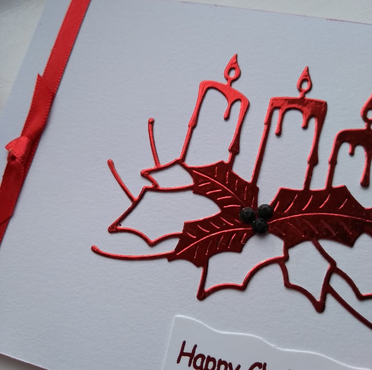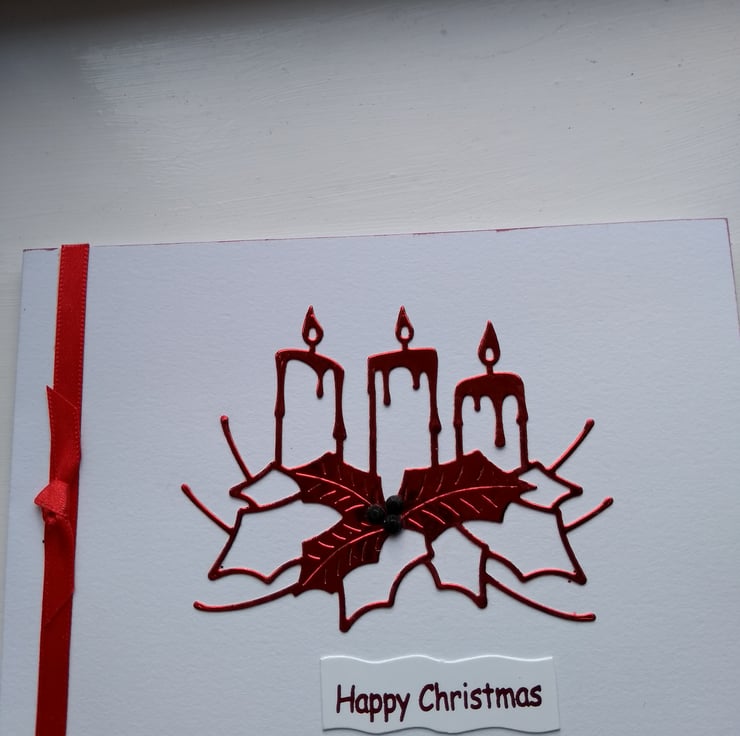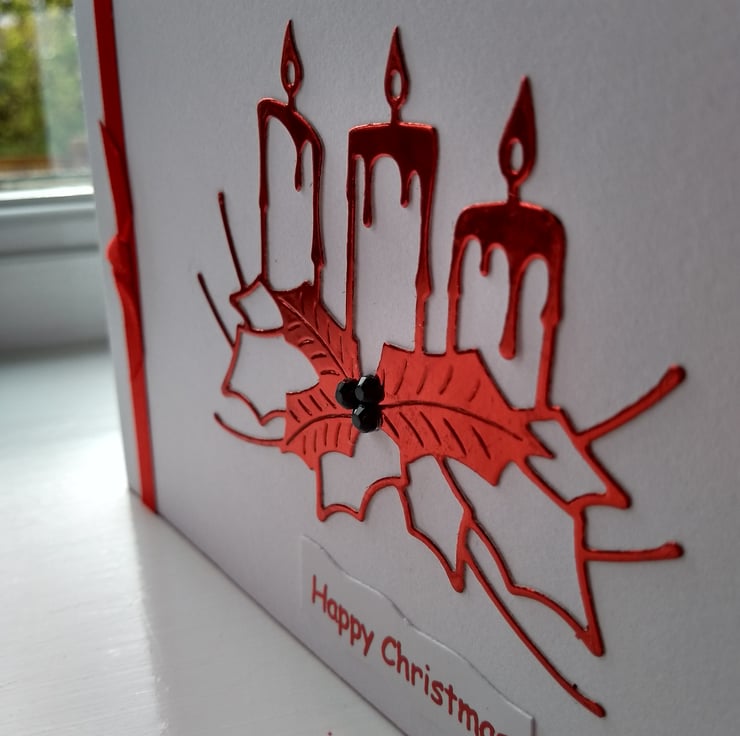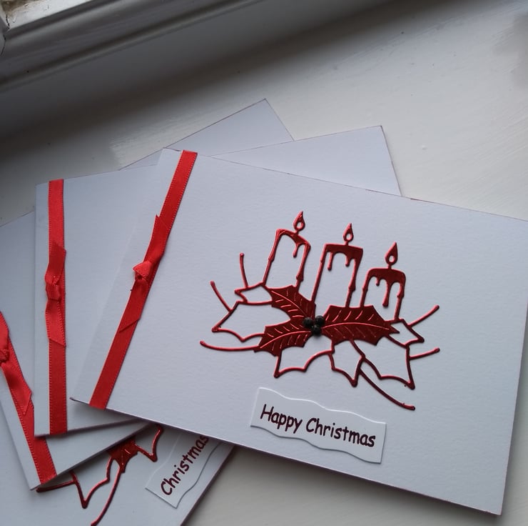 A completely handmade and uniquely designed set of 4 cards, same design and colourway. Consisting of a row of candles die cut from red mirri card. Mounted onto pristine white quality card. Black beads for berries and festive tag. Finished off with red ribbon and bow