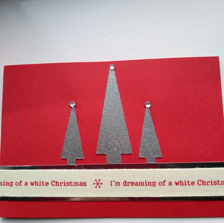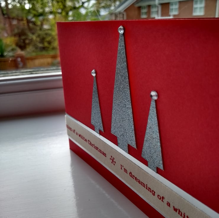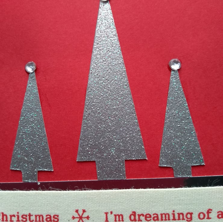 A completely handmade and uniquely designed pack of 4 same design and colourway cards. Consisting of a row of three Christmas trees hand cut from silver glitter card with rhinestones topping then off. Mounted onto quality red card. Finished off with festive ribbon mounted onto silver mirri card