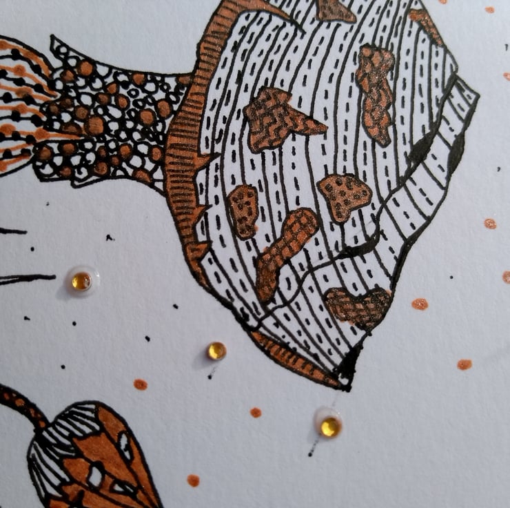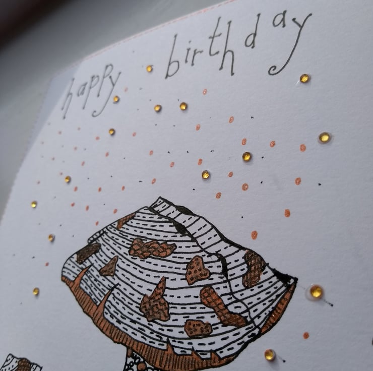 A completely handmade and uniquely designed card. Consisting of three mushrooms hand drawn in black ink and hand coloured with bronze glitter own. Drawn on pristine white quality card. Happy birthday hand written in black ink. Finished off with gold rhinestones