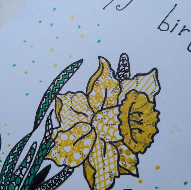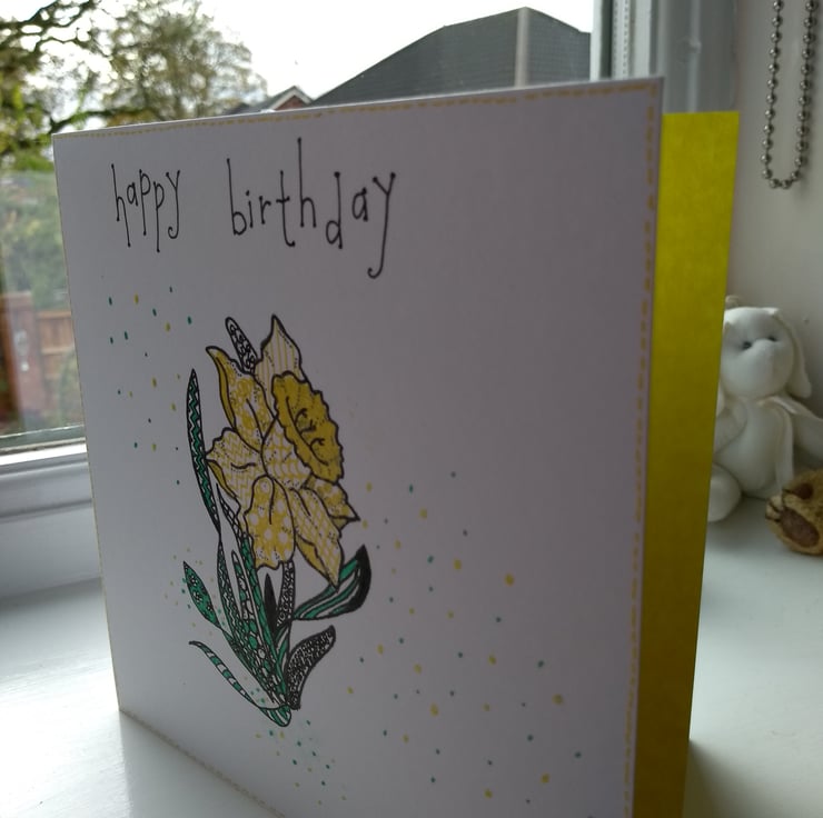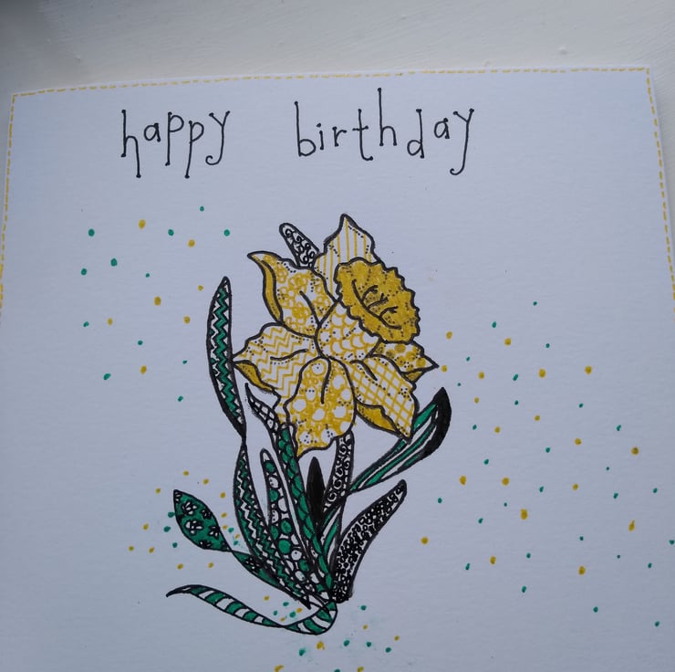 A completely handmade and uniquely designed card. Consisting of a stamped image of a Daffodil. Hand coloured on pristine white quality card. Happy birthday hand written in black ink.
