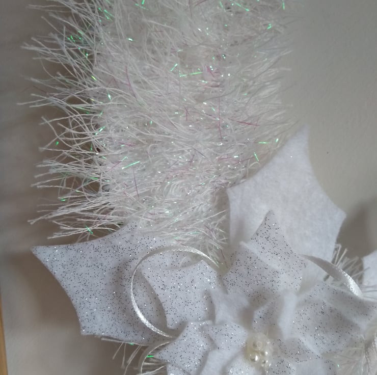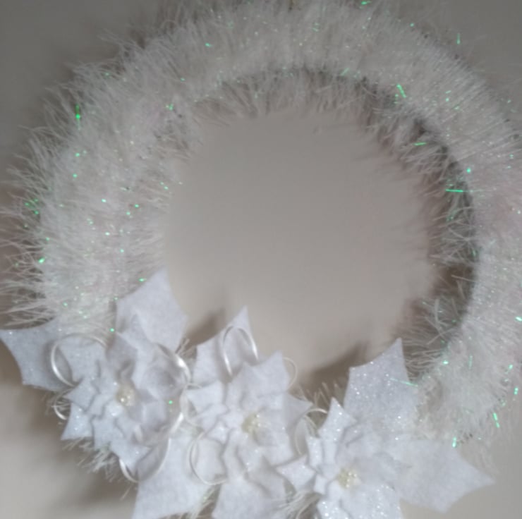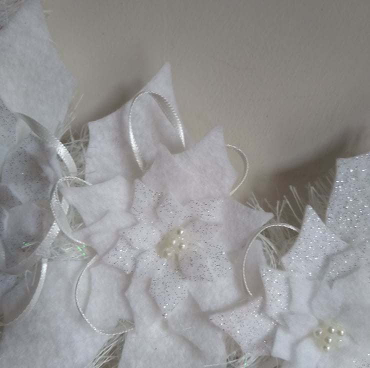 A completely handmade and uniquely designed wreath. Consisting of a copper wire base which has been wrapped with silver/white yarn. There poinsettias die cut from felt both plain white and glittered adorn the front, finished with ribbon and pearl beads.