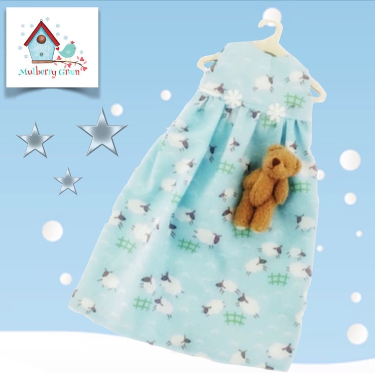 A sweet little cotton nightdress to fit the Mulberry Green characters with a sleepy sheep print. The nightdress comes with a little tiny teddy, just big enough for Maisy and her friends. The nightdress comes on a cute little wooden hanger.