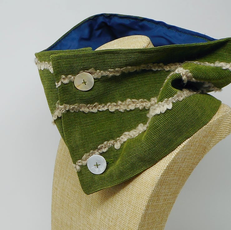 Seaweed slouchy forest green button up cowl, fully lined in blue acetate. Three wavy lines of machine couched textured yarn in a soft beige have been added. Fastening is two shell buttons and matching stitched buttonholes.