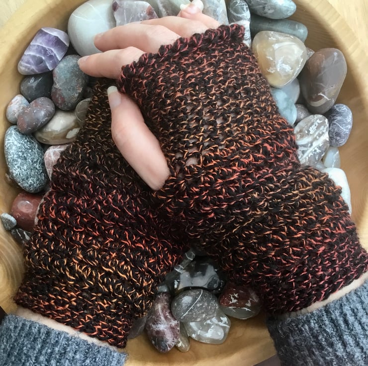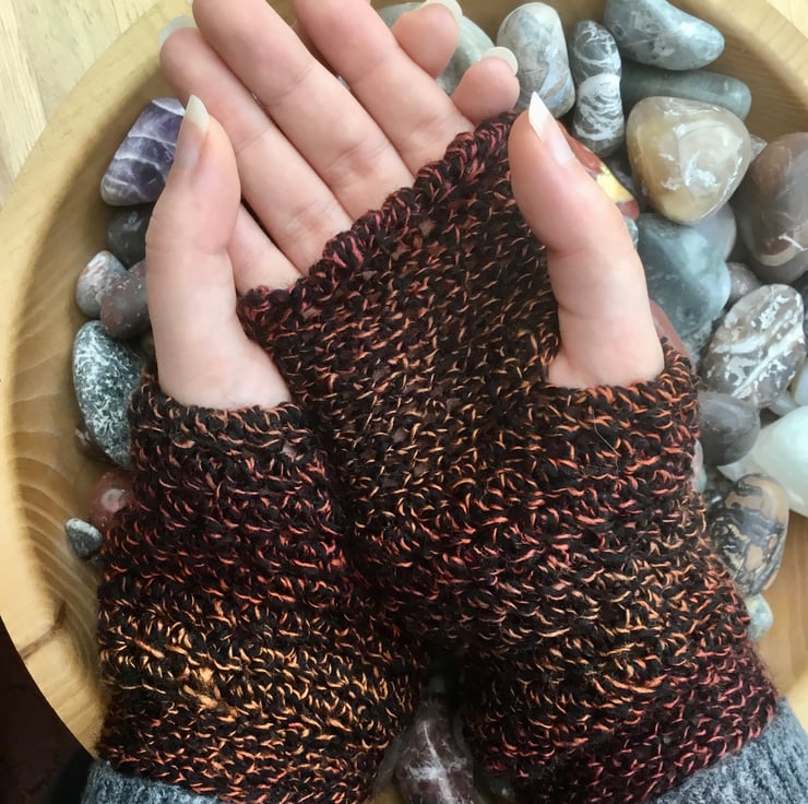 Autumn Tones. A pretty brown pair of Fingerless mittens are a pair of crocheted accessories to keep your hands & wrists warm, cosy & stylish!
