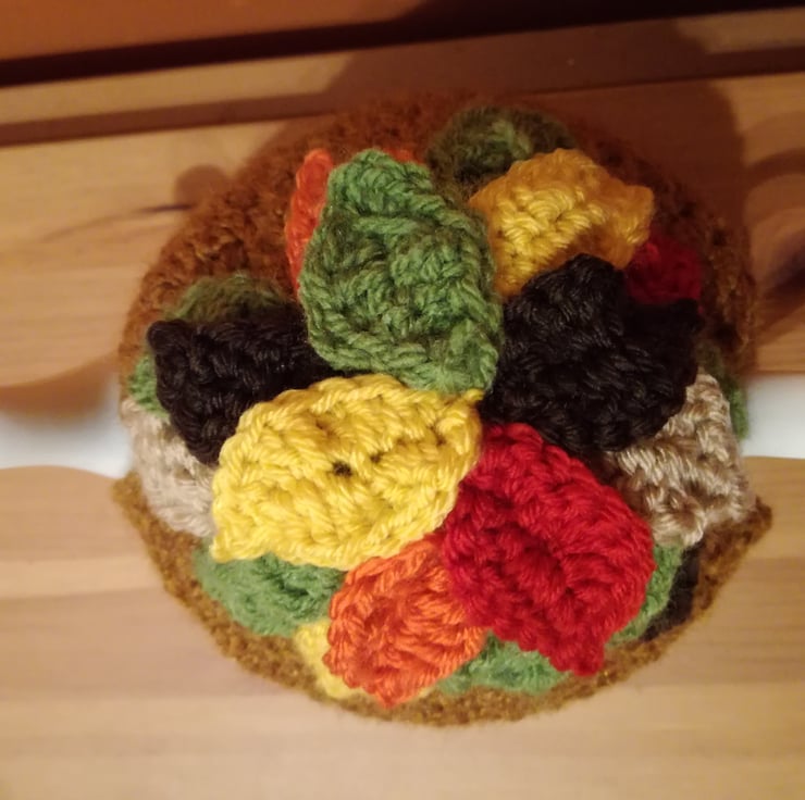 The main body is worked in crochet and finished with crochet leaves in many autumnal colours!