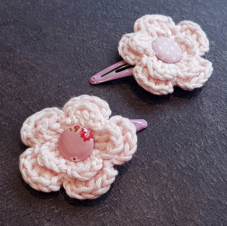 Crocheted in baby pink cotton, and both sewn and glued onto light pink clips.