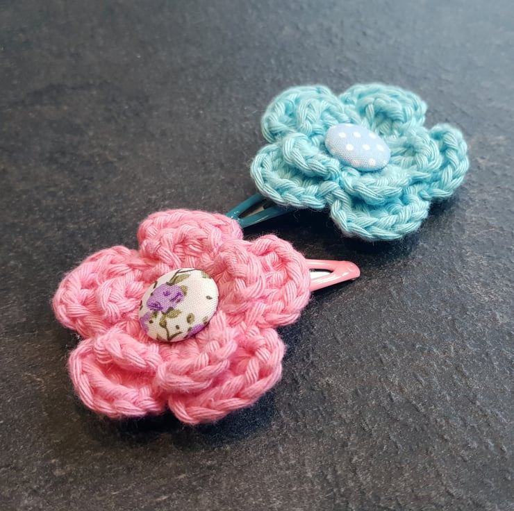 Crocheted in baby pink and baby blue cotton, and both sewn and glued onto pink/blue clips