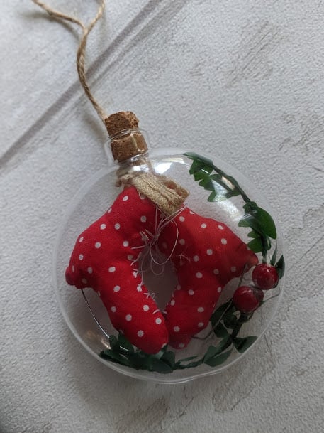 Hand and machine stitched a little pair of red with white spots ice skates sit sweetly in a glass bauble trimmed with a lacey cream trim on a sprig of holly and berries.