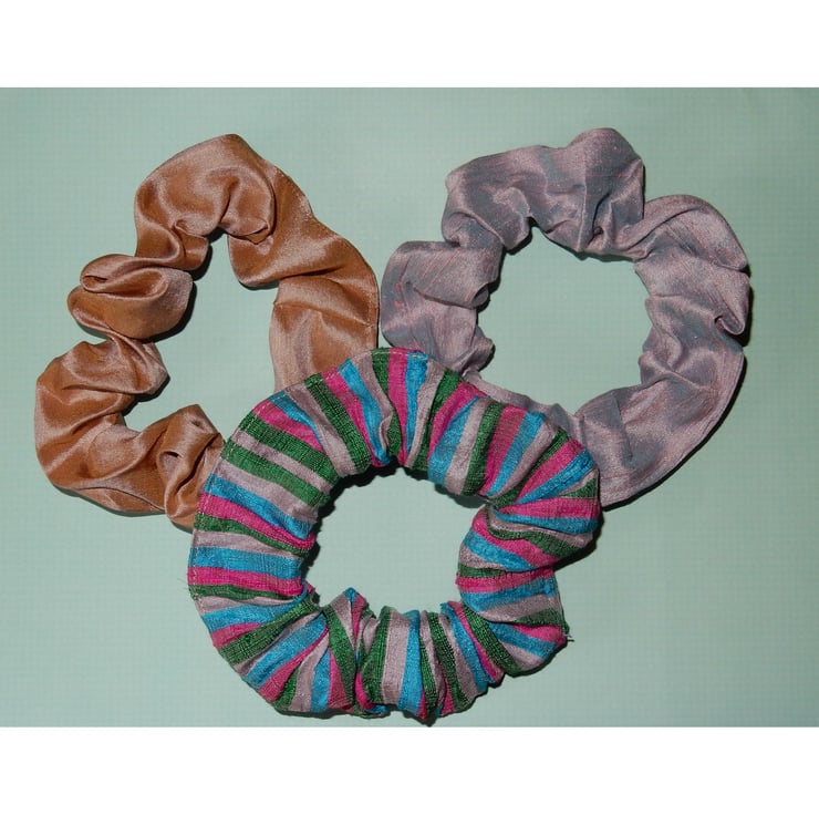 These silk scrunchies are ideal for the festive season, being silk they shine, and show a variation in colour as the light catches them.