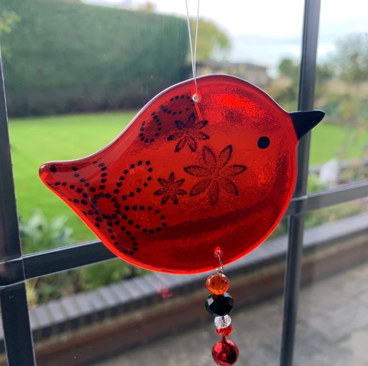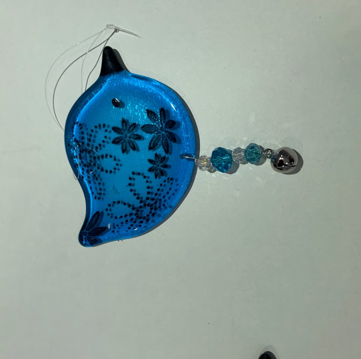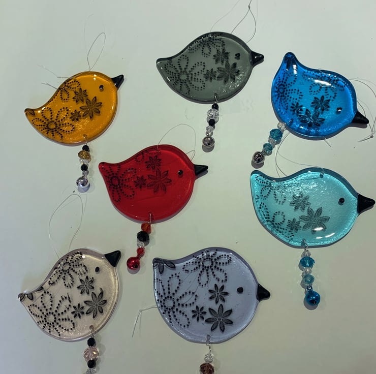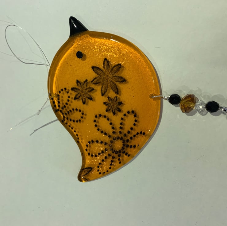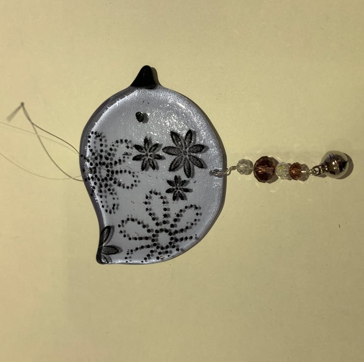 A beautiful handmade fused glass hanging bird with attractive beaded detail and embossed pattern. The bird measures approximately 8cm and as each is handmade it may vary slightly form the attached photos.