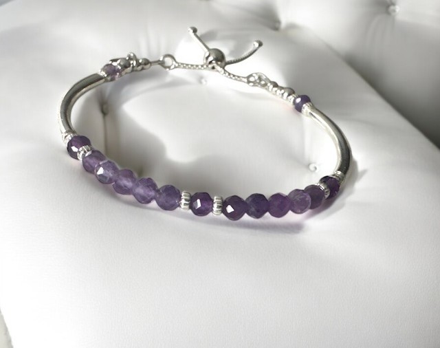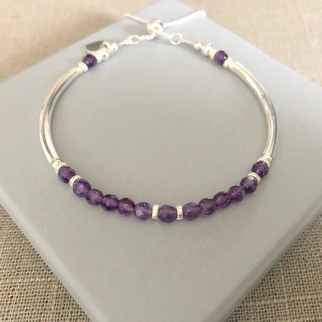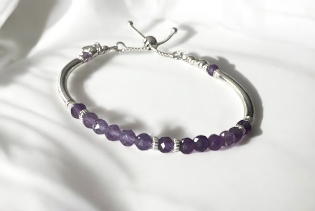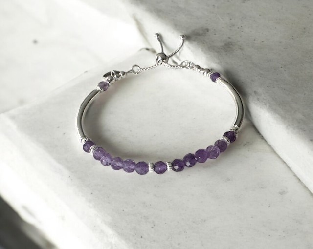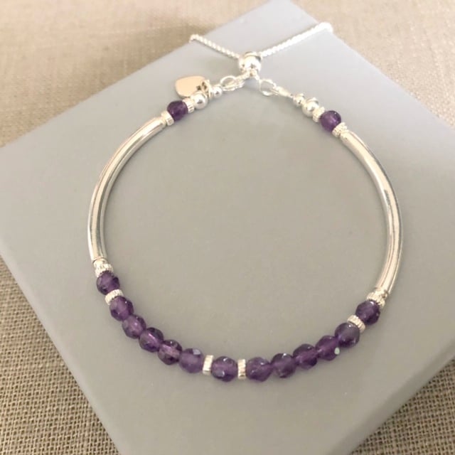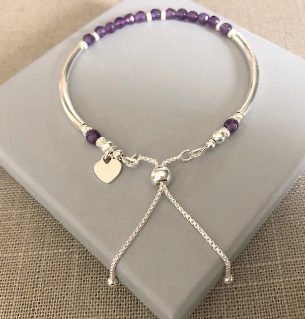 Purple Amethyst Gemstone with Sterling Silver Slider Clasp - Handmade bracelet made with 4mm faceted purple Amethyst semi precious gemstones with Sterling Silver beads and long tube beads. I added the 8mm Sterling Silver heart charm, this charm can be personalised with one initial letter. The bracelet is finished with a Sterling Silver slider clasp. The adjustable slider clasp provides not only a perfect fit for your wrist but also ease of wear, allowing you to effortlessly put on and take off the bracelet. This functional feature ensures that your bracelet stays comfortably in place, creating a seamless, custom fit every time you wear it.