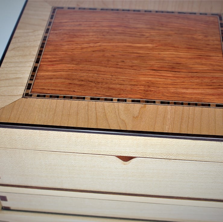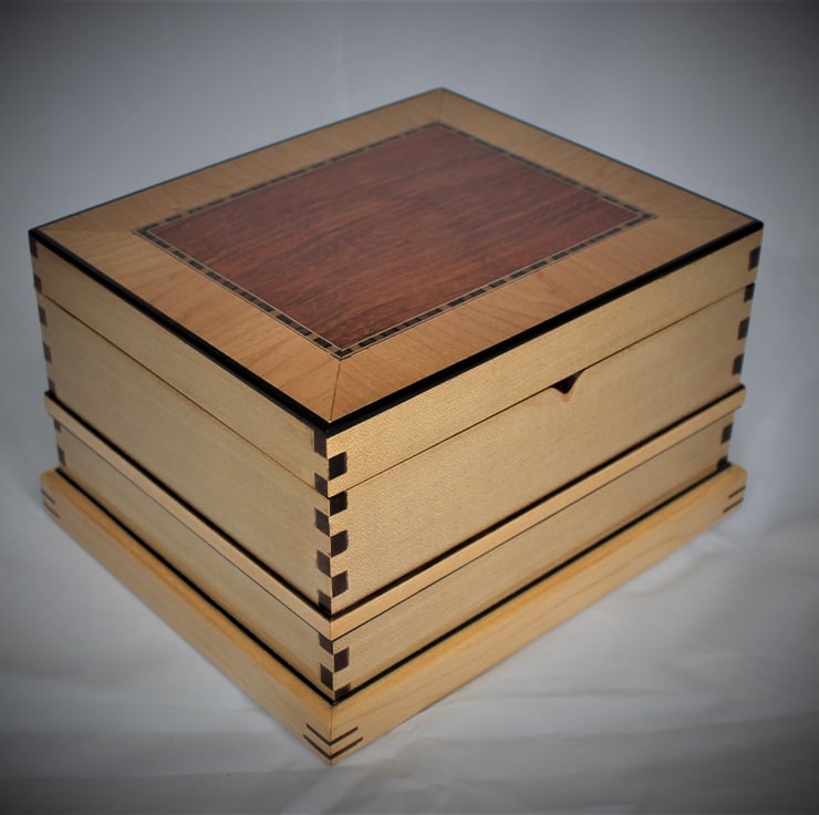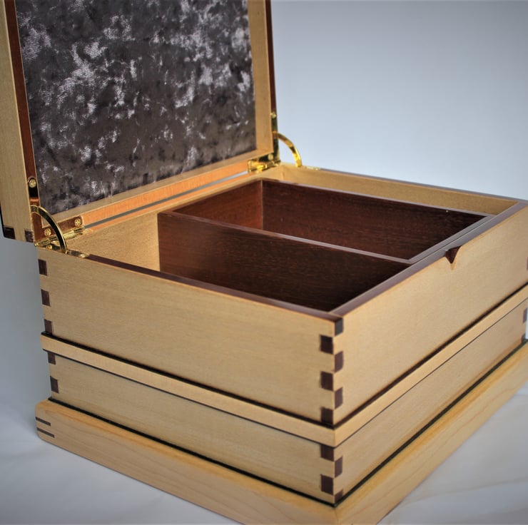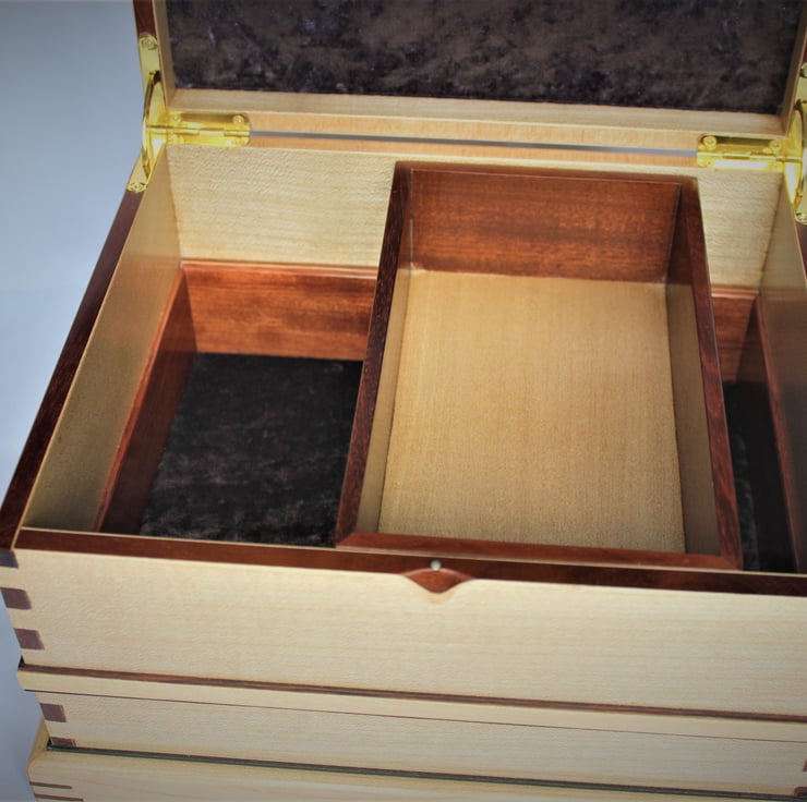 A decorative wooden box that can be used for some of the larger items of Jewellery, such as bracelets, broaches - perhaps even a tiara. But this box was designed to go a bit further of the scope of functionality. If you like this box could make for a very good Memories or keepsake box. It could be big enough to hold a life time of memories, from the day of birth to christening, right up till it can be passed on to another generation. Because keepsake doesn't have to mean for one person to keep it, but instead "keep it in the family" keepsake. The decorative wooden box has been handmade from start to finish and is a one off piece. Using some exotic wood species, some fine veneers and an interesting and effective display of decorative joints. The box stand at 17cm high, 23 1/2 x 28 cm measuring at the base of the box. Brass quadrant hinges are used for the lid. Inside the lid and at the bottom of the box, are lined with a metallic look crushed velvet material that shimmers when you look at it in different angles. The fitted half tray inside measures 20 x 12 x 5 1/2 cm high.