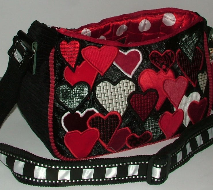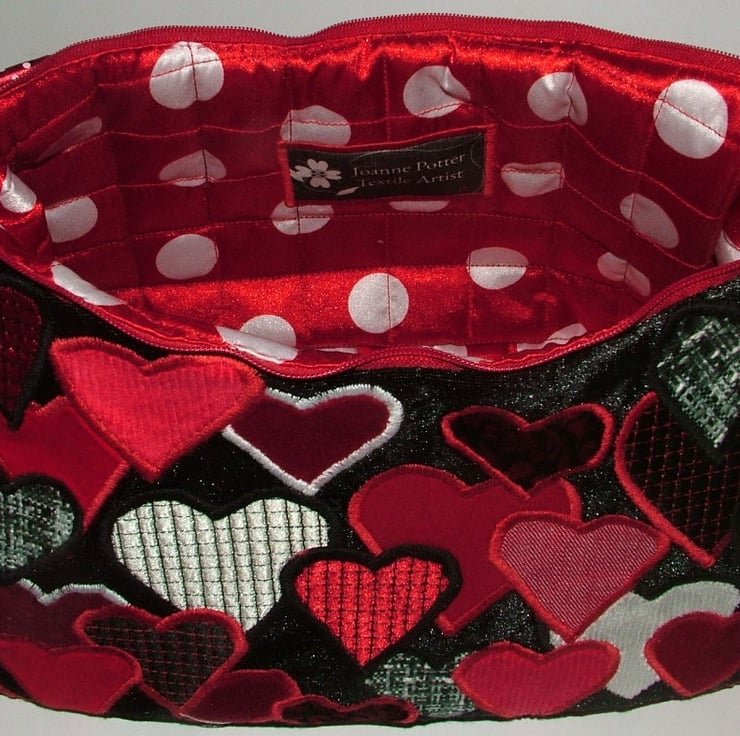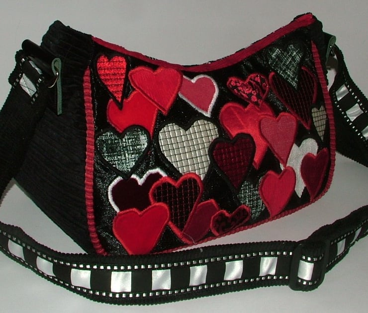 The front is a panel of shiny black velvet that has been appliqued in many hearts (22 in total), of many textures with zig-zag stitching.