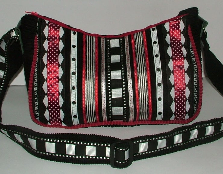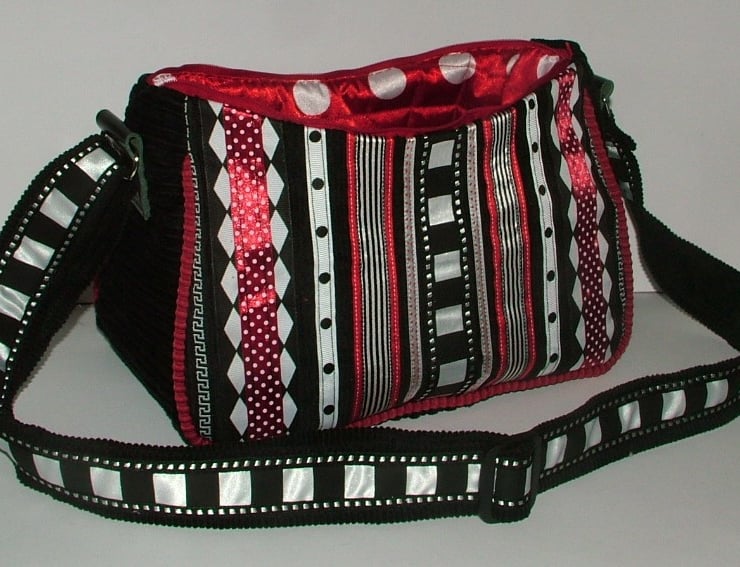 This handbag is made from a combination of textured fabrics in red, Black and White.