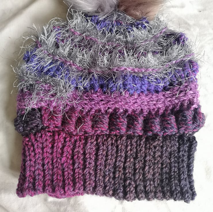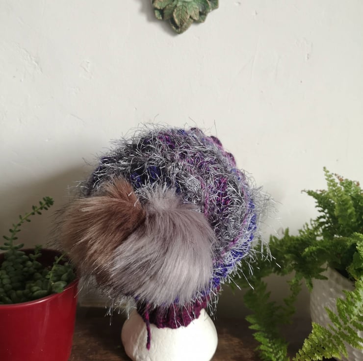 This beanie has faux fur yarn around the spiral that radiates from the crown, upon which sits two complementary faux fur pom poms.