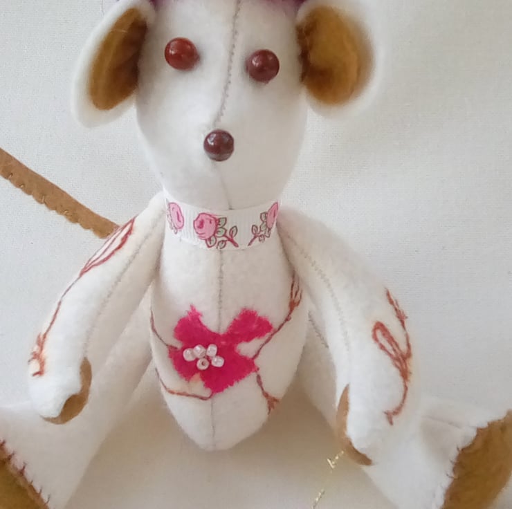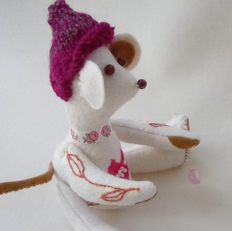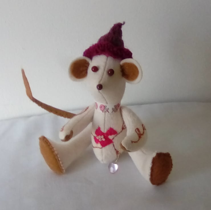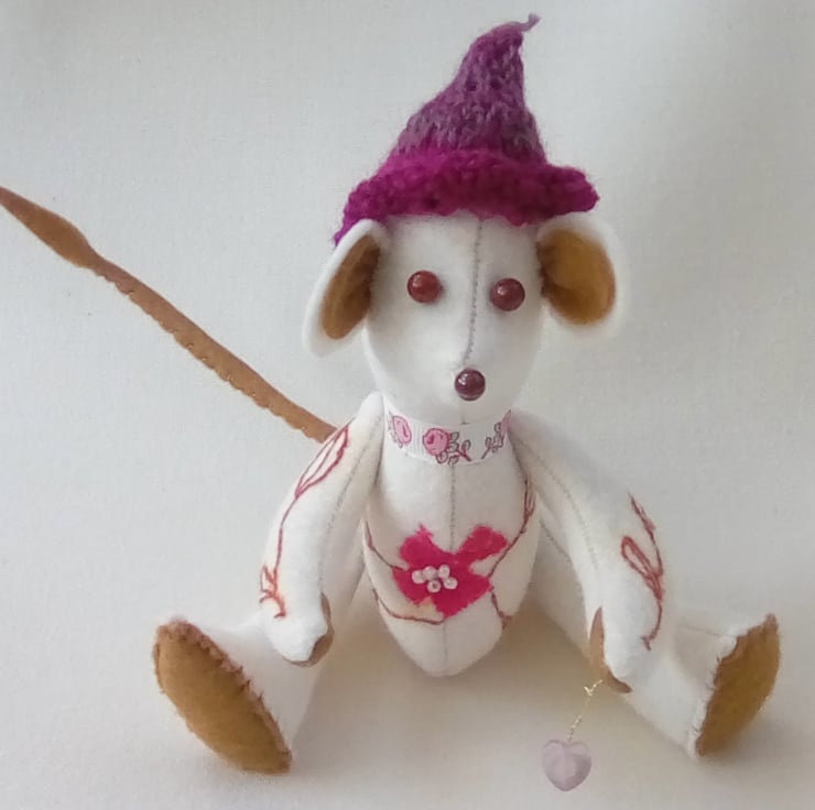 Mitzi is a little shy and as you can see she wears her heart on her sleeve. Mitzi is made from wool felt which I have embroidered with flowers and leaves. She has a knitted hat and carries a heart shaped button. She is 5.5 inches high.