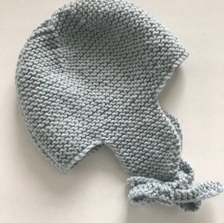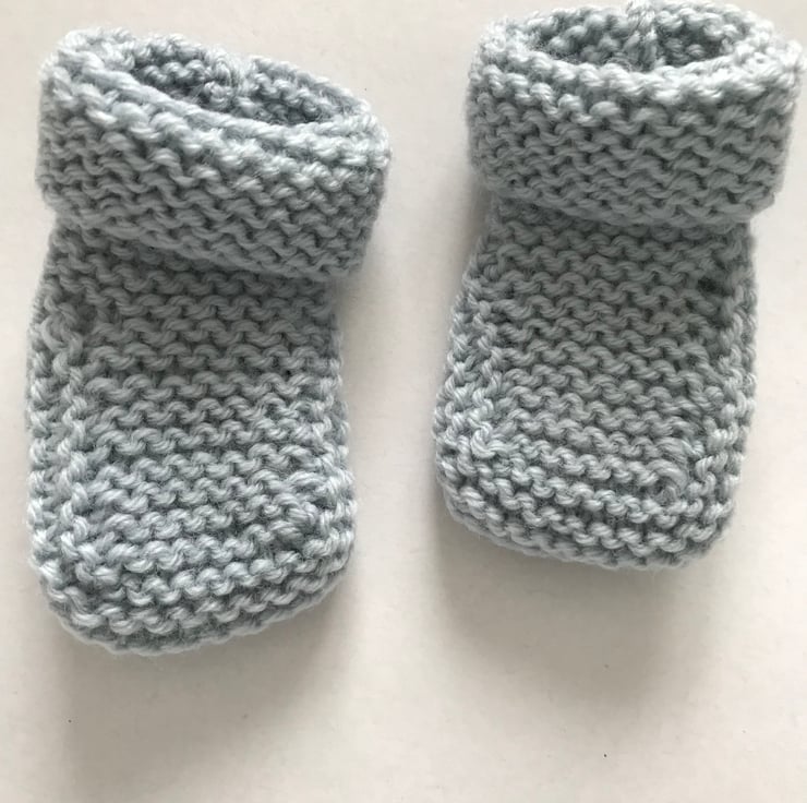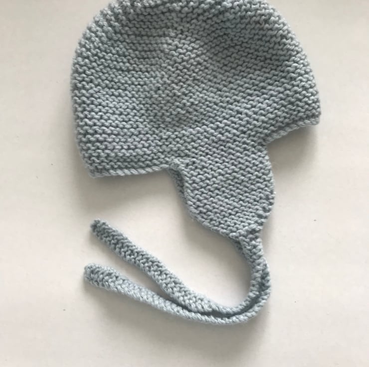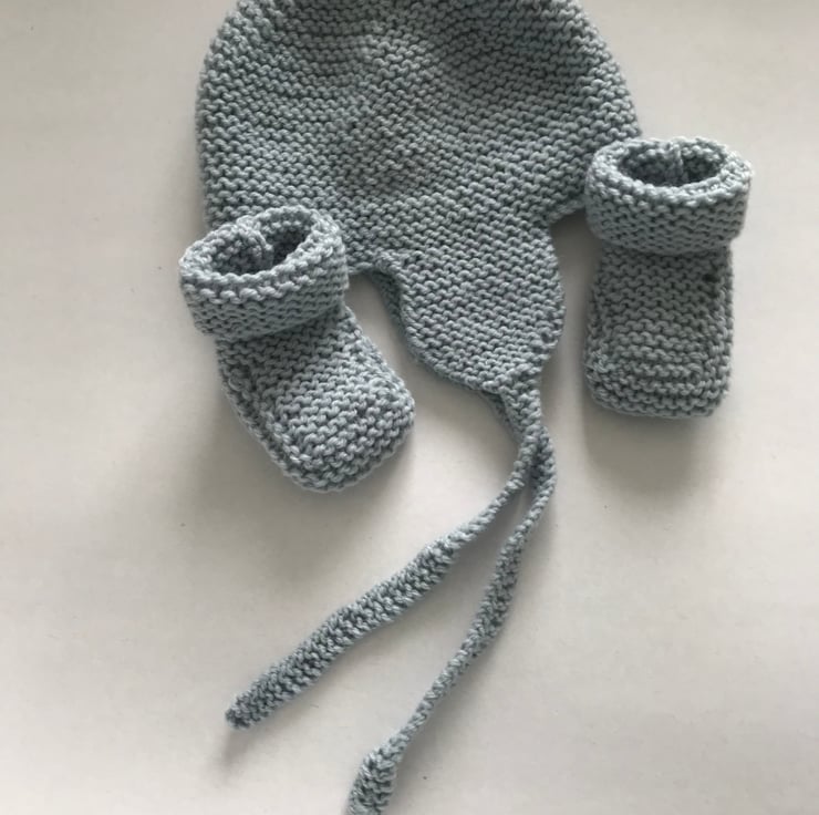 The handmade hat is knitted in a soft baby yarn. The hat has earflaps and ties under the chin. The matching bootees have folded over cuffs. The yarn colour is duck egg blue but I think it is more light grey