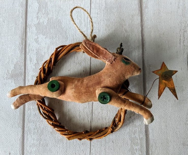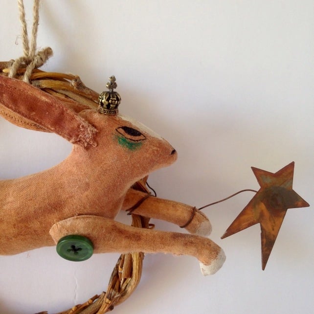 This little hare has been given a vintage feel hand and machine stitched and hand stained and painted. He sports a tiny crown on his head and he carries a rusty tin star just fallen from the evening sky. On each leg is a forest green button.