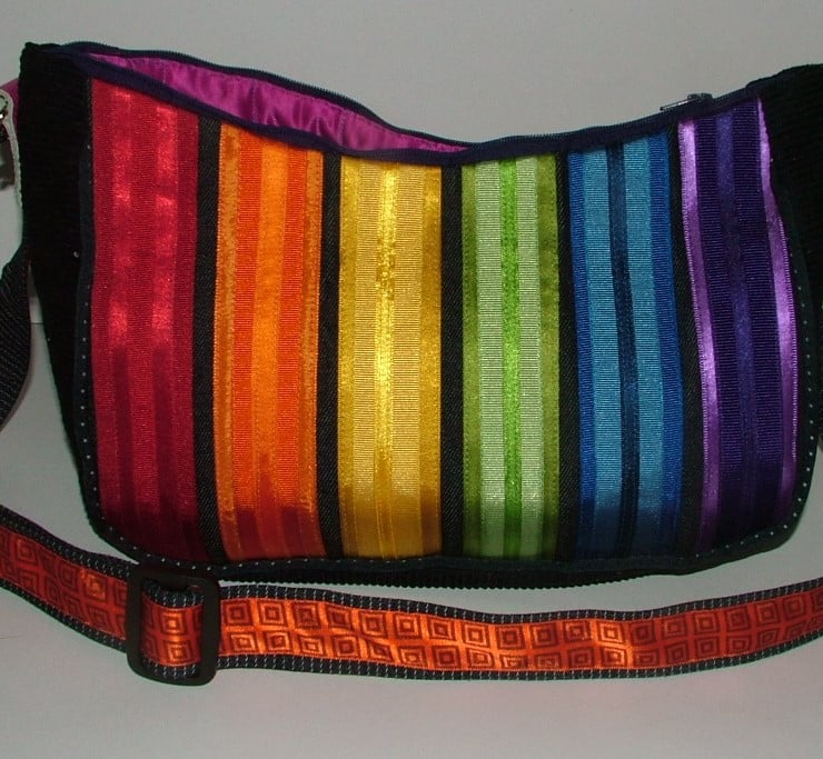 the back panel is also a blue denim panel this time overlaid with satin ribbon in 5 different colours to create a rainbow effect.