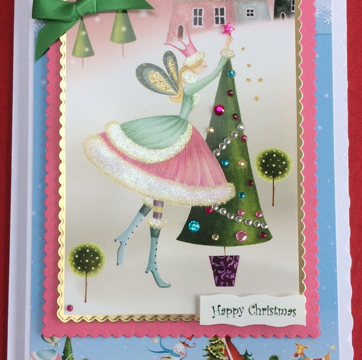 This is a lovely luxury 3D handmade greeting card with a cute fairy decorating her Christmas tree out in the snow. It has gems and a lovely green bow and the 3D greeting has been green foiled and says "Happy Christmas".