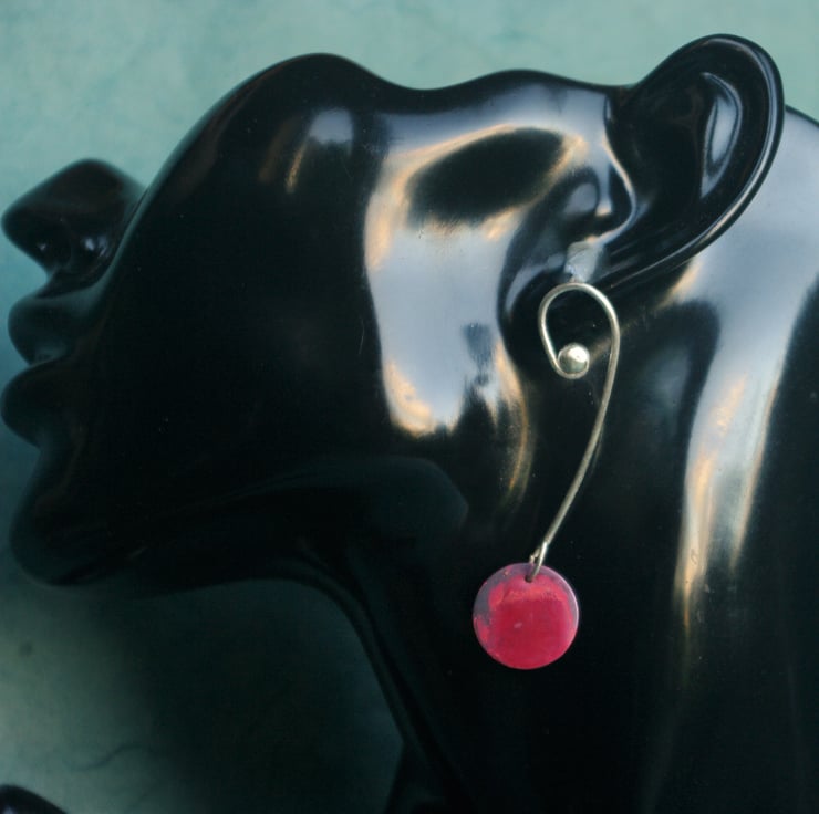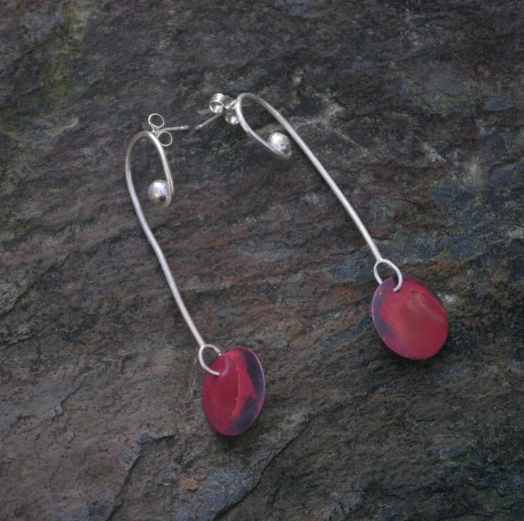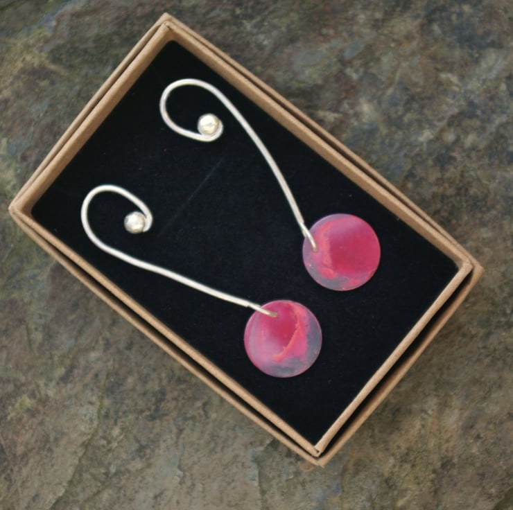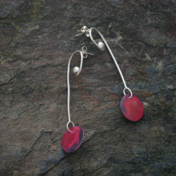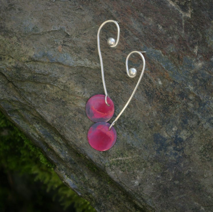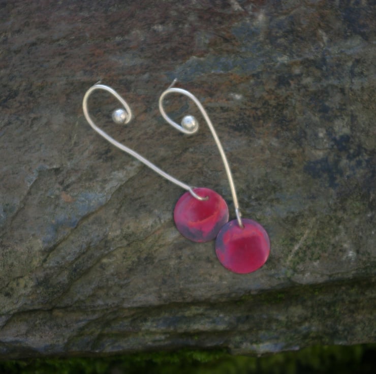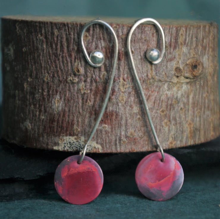 I have hung red copper discs from a swirl of sterling silver wire. The luscious red tones achieved with the application of heat . This is protected with a wax coating.The silver swirl sits neatly on the earlobe with a big blob of silver at the end of it. The whole earring has a slight twist to it, designed so that it doesn't hang down vertically but with a bit of a jaunt , giving the earrings a statement quality . They are fastened to the ear with sterling silver earposts and butterfly scroll backs.
