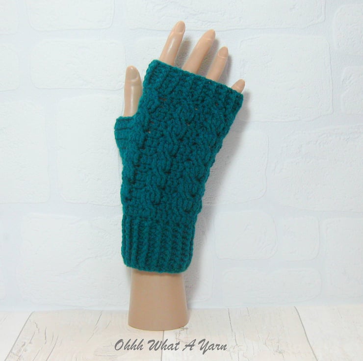 They are crocheted using 100% acrylic yarns in a gorgeous shade of teal, petrol, peacock blue.